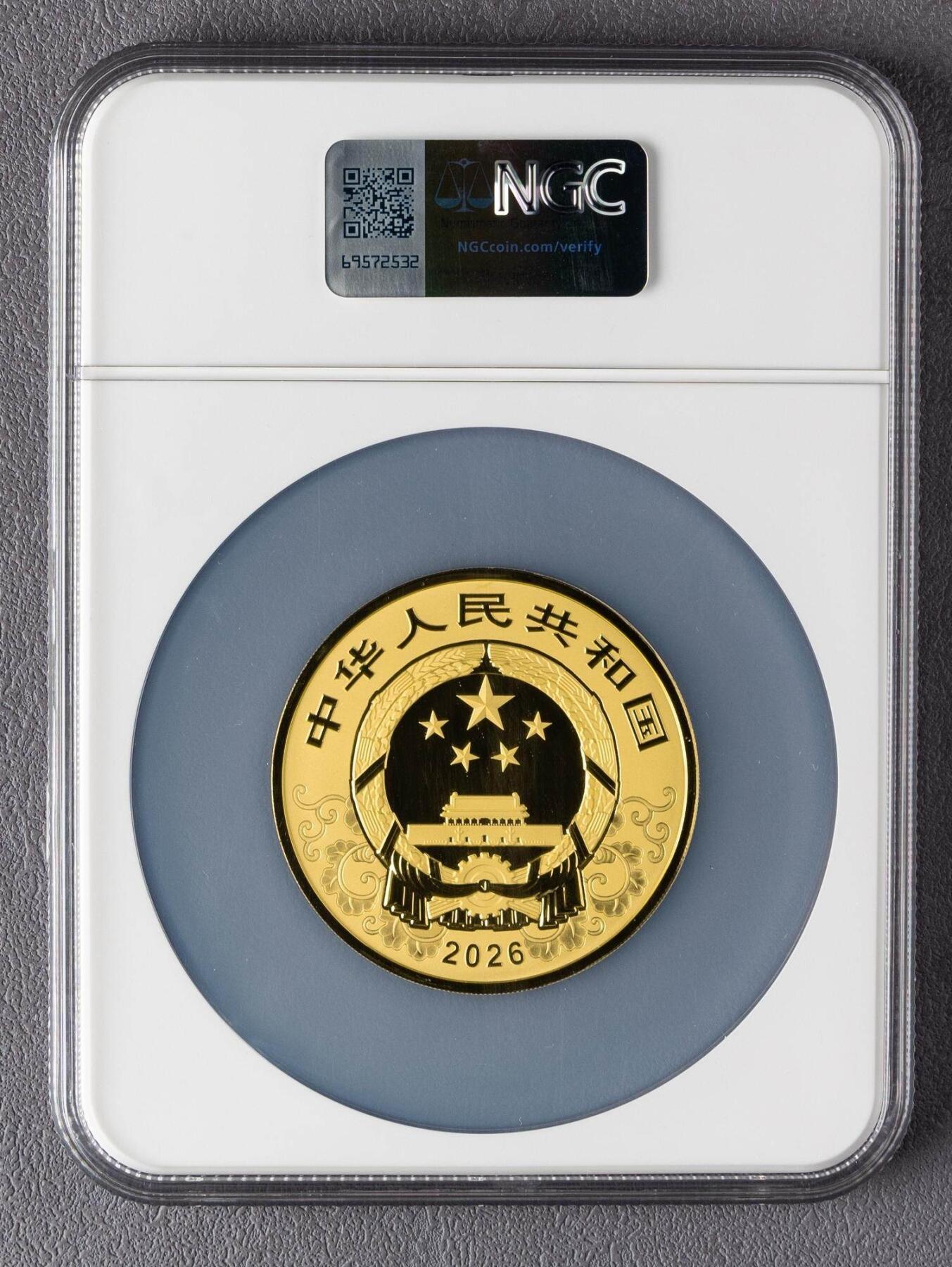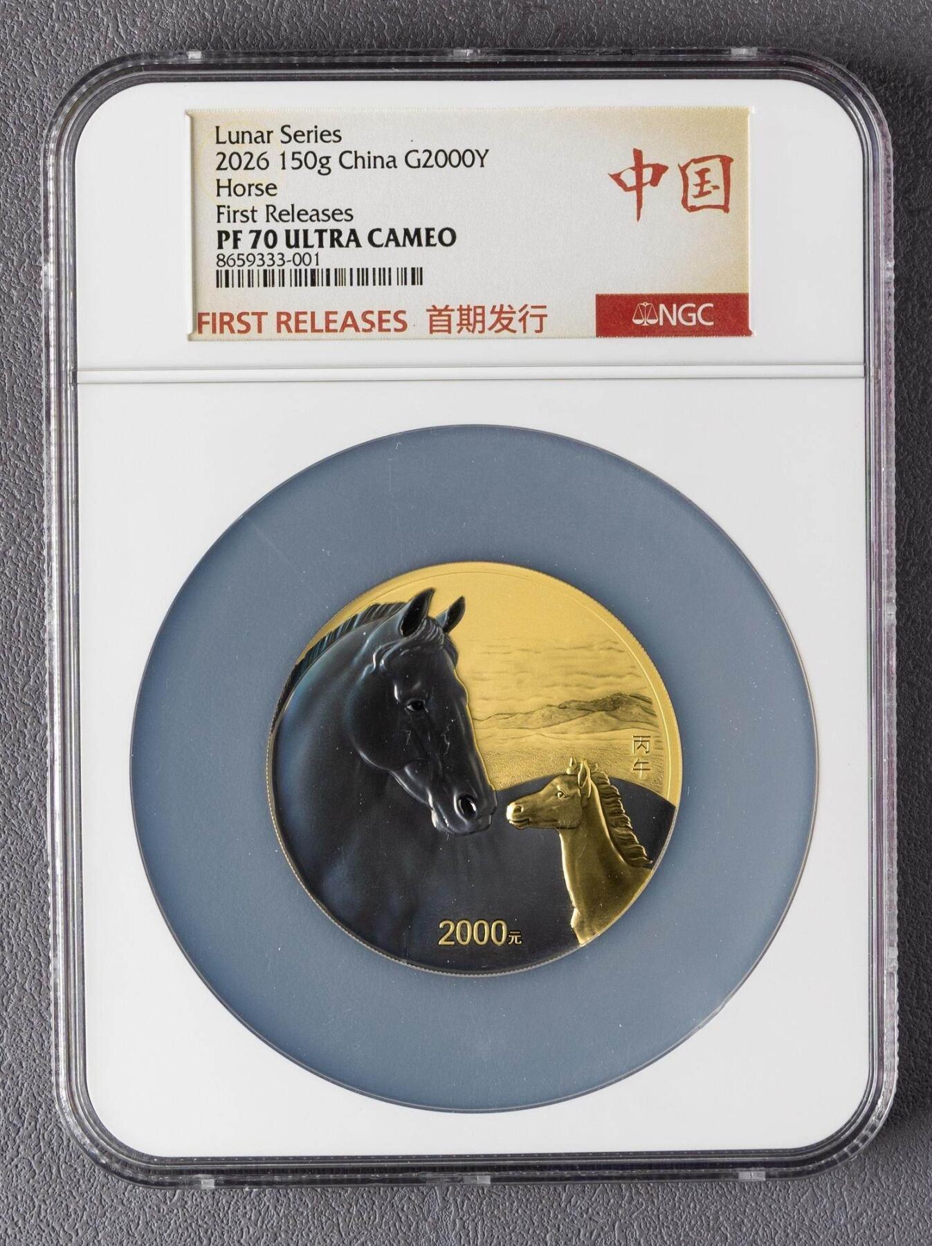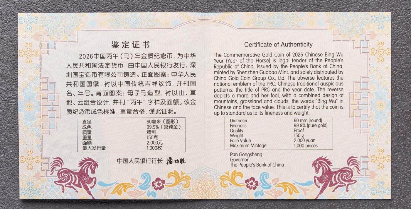 1. 基础规格:精制币,150克纯金99.9%,直径60mm,面额2000元;沈阳/上海/深圳国宝造币铸造,中国金币总经销。 2. 发行量:最大发行量1000枚(稀缺度高)。 3. 图案与工艺 - 正面:国徽+传统吉祥纹饰,刊国名、2026年号。 - 背面:母子马造型,衬山、草地、云,刊“丙午”与面额;采用突破清边超高浮雕,母马叠加光变鳞彩+镀黑,背景手绘研磨 。