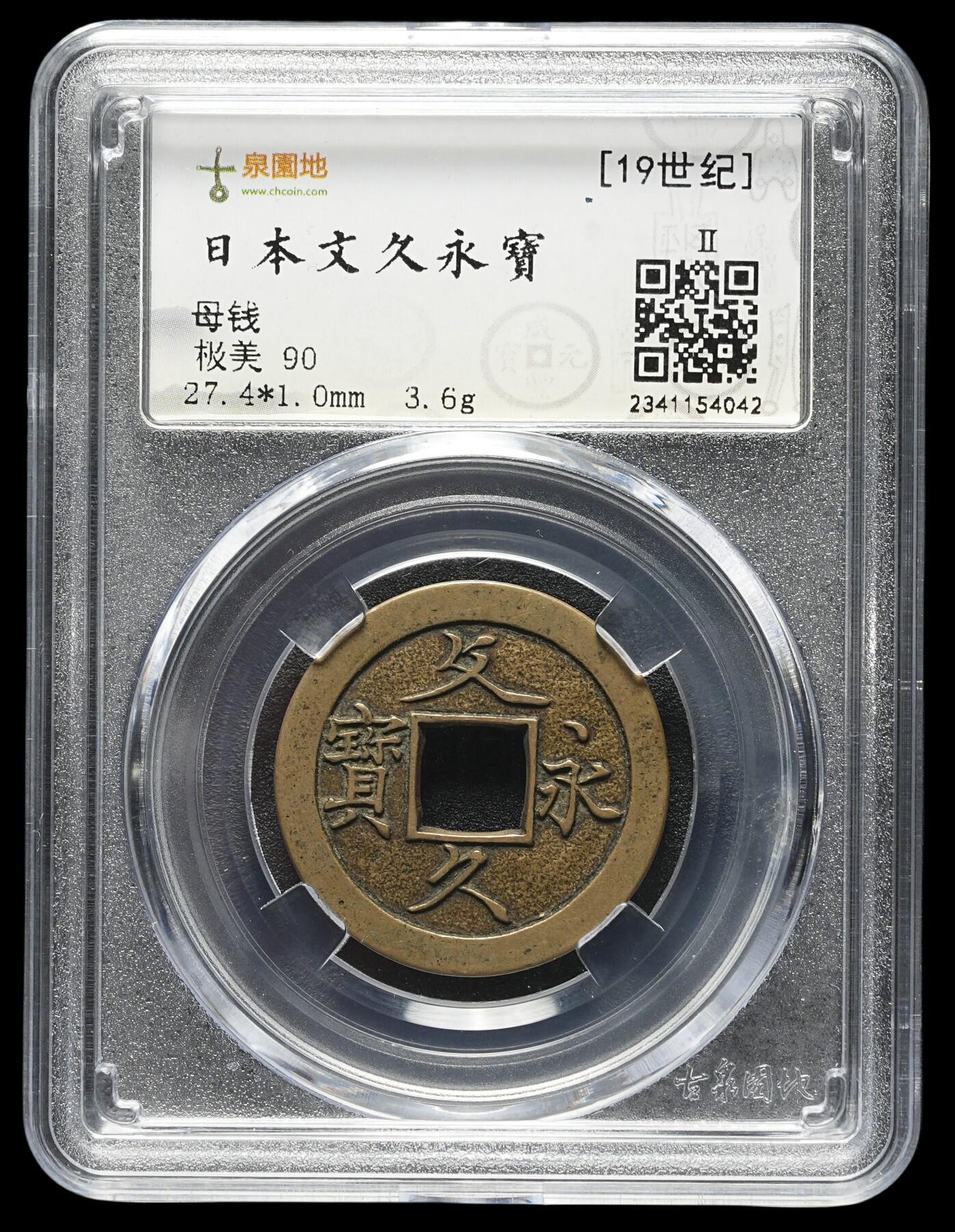 🔍 核心信息 - 年代:19世纪(日本江户幕府末期,文久年间,1861–1864年) - 身份:文久永宝母钱(铸造子钱的模具钱,存世远少于流通子钱) - 规格:直径27.4mm,厚1.0mm,重3.6g - 版别:正面为“攵久永宝”(真文版),属于相对少见的版别 文久永宝流通子钱存世量极大(约9亿枚),价格低廉;但母钱存世稀少,价值显著更高。