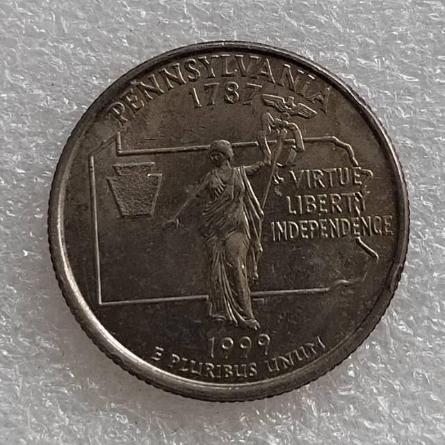 宾夕法尼亚 25 美分币是50个州纪念币计划的第2枚(1999年3月8日发行),描绘的是这个“共同的财富”州的轮廓线,州的格言以及冠石。选择这个设计是帮助人们更好的了解第2个州的建立,它是1787年12月12日加入联邦政府的。