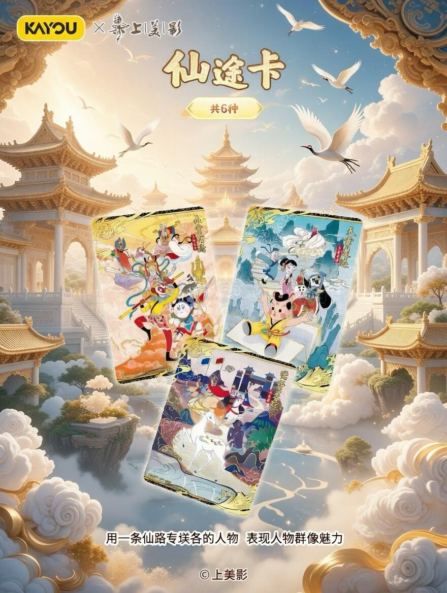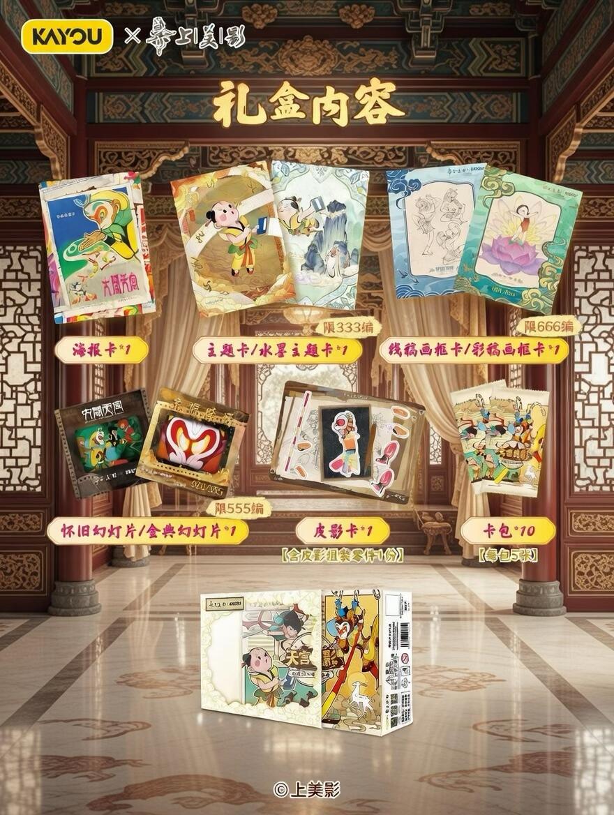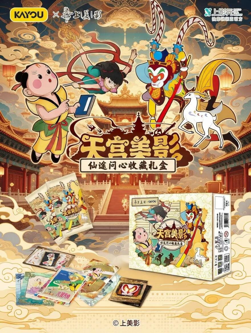 谁懂啊!找齐这些神仙卡片真的会疯魔😭 小时候看《天书奇谭》《大闹天宫》的DNA狠狠动了!但现在翻遍家里只有泛黄的画册…连孩子都没见过这么绝的美猴王和哪吒!这波KAYOU×上影元联名的「天宫美影」礼盒直接戳中我的童年泪点——集齐80+张神仙卡,还有非遗剪纸工艺的隐藏款!最绝的是齐天大圣的筋斗云卡面会变色!现在囤货还送孙悟空手办!再不抢就只能看别人晒卡了!