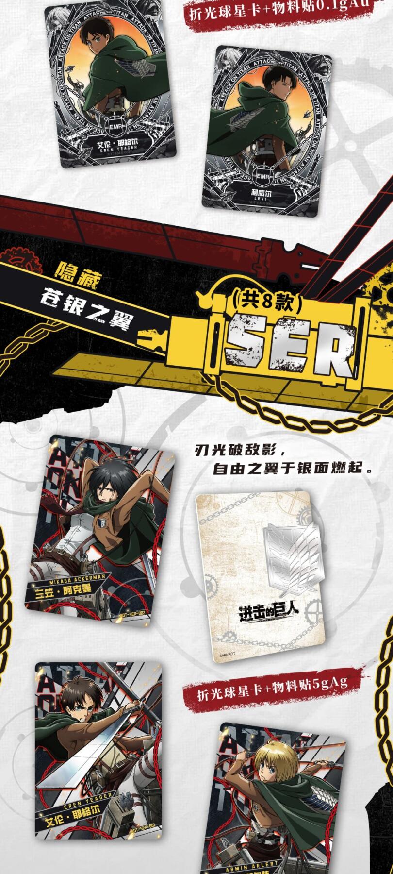 这一弹卡牌简直是“信念”的具象化!💎 全系列高精度复刻,从艾伦坚定的背影,到利威尔兵长帅气的斩击,每一帧都是壁纸级神颜!⚔️ 特殊工艺加持,立体机动装置的金属质感扑面而来,仿佛能听到立体机动装置喷射的轰鸣声。