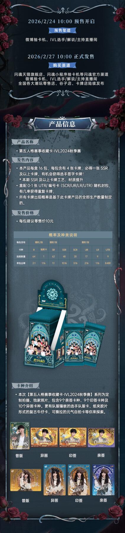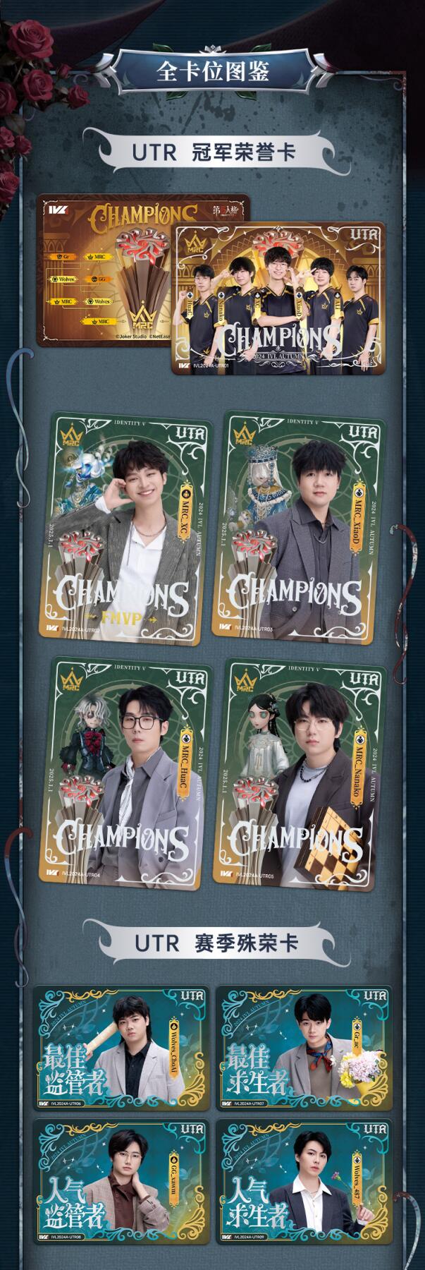 第五人格赛事收藏卡-IVL2024秋季赛预售开启 IVL官方出品的电竞收藏卡——第五人格赛事收藏卡-IVL2024秋季赛现已开启预售! 全图鉴完整亮相,定制拍摄、独家照片,——从基础选手卡到冠军荣誉卡,从选手队服卡到元气自拍卡。每一张都是对IVL2024秋季赛场的全景还原。 延续平行系列,普版、异画、印签、亲签,每一款平行卡都有专属卡面与独特神态,凝刻选手多面风采。