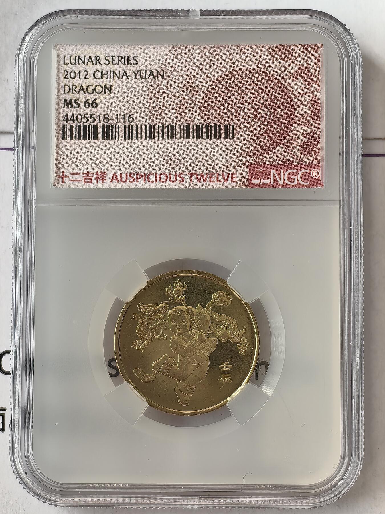 - 全称:2012年贺岁普通纪念币(壬辰龙);央行2012年8月28日发行,面值1元,黄铜合金,直径25mm - 发行量:8000万枚(首轮生肖币中发行量大幅扩容的品种,直接决定长期溢价有限) - 图案:正面“中国人民银行”“1元”“YIYUAN”“2012”;背面为传统服饰小男孩舞龙,右下“壬辰” - 配套装帧:康银阁卡币(498万套)、精制币(2万枚,少见);铜质流通币,可等值流通