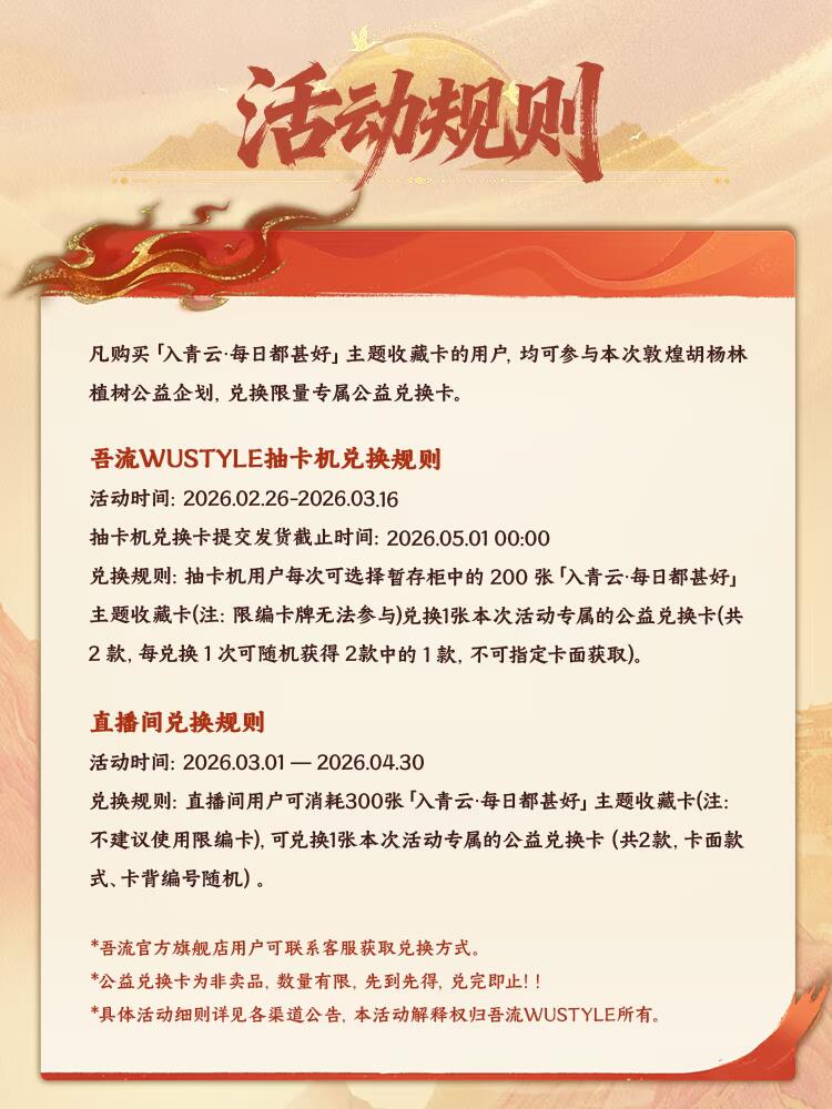 兑换规则:直播间用户可消耗300张「入青云·每日都甚好」主题收藏卡-余音系列(注:不建议使用限编卡),兑换1张本次活动专属的公益兑换卡(共2款,卡面款式、卡背编号随机)。