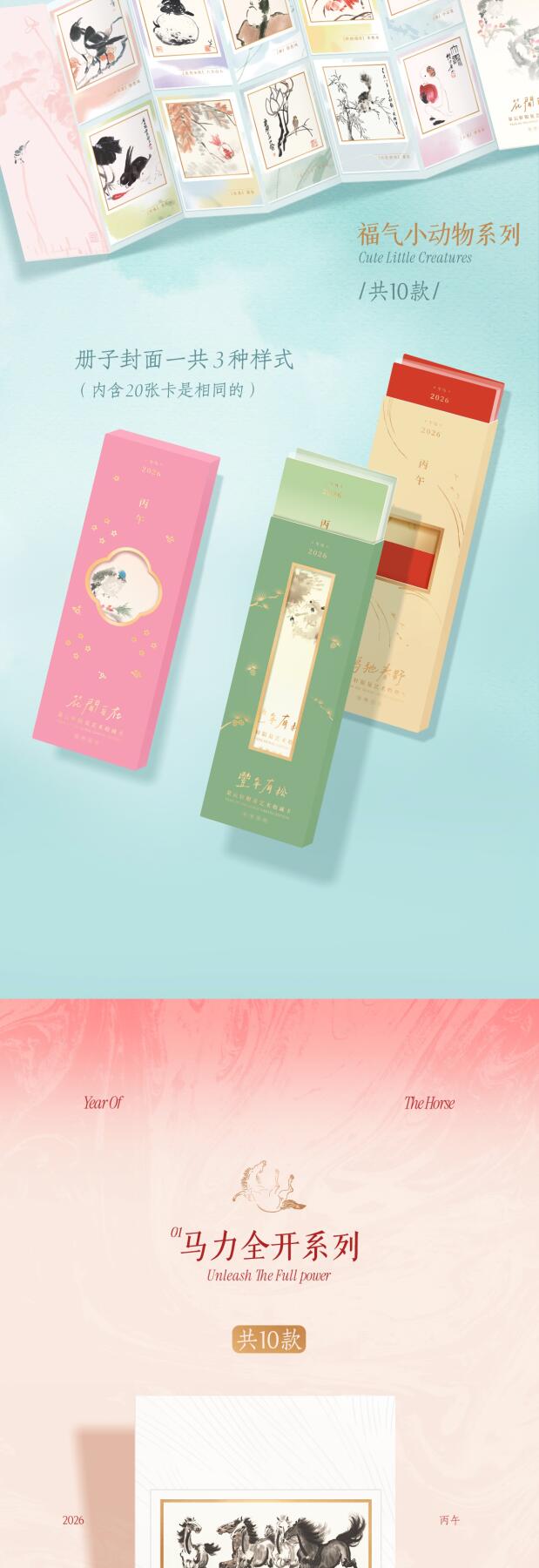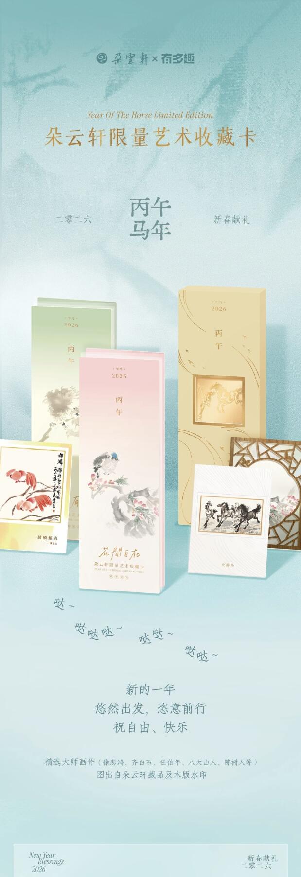 精选徐悲鸿、齐白石、任伯年等名家真迹,以朵云轩馆藏与木版水印非遗工艺复刻,水墨气韵跃然卡面。马力全开骏马系列、福气萌宠系列双主题,压纹、花窗、小书景多重工艺加持,质感细腻高级,每一张都是可收藏的国风艺术品。