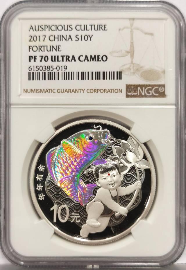 - 发行单位:中国人民银行 - 发行时间:2017年6月19日 - 面额:10元 - 材质:99.9%银 - 重量:30克 - 直径:40毫米 - 形制:圆形精制币 - 最大发行量:60000枚 - 正面图案:国徽、国名、年号2017 - 背面图案:持莲童子、鲤鱼、云水纹组合图案,刊“年年有余”字样及面额 - 工艺:采用幻彩全息工艺