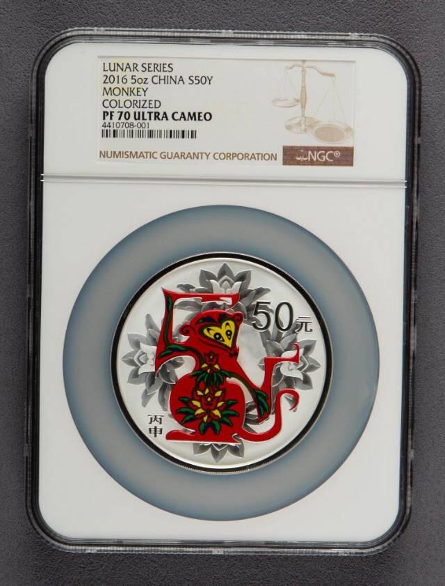 一、5盎司圆形彩色银币 1. 尺寸:直径70毫米 2. 发行量:30000枚 3. 正面:国徽+连年有余纹饰,国名、2016年号 4. 背面:民间传统装饰猴(局部彩色),刊“丙申”、50元面额