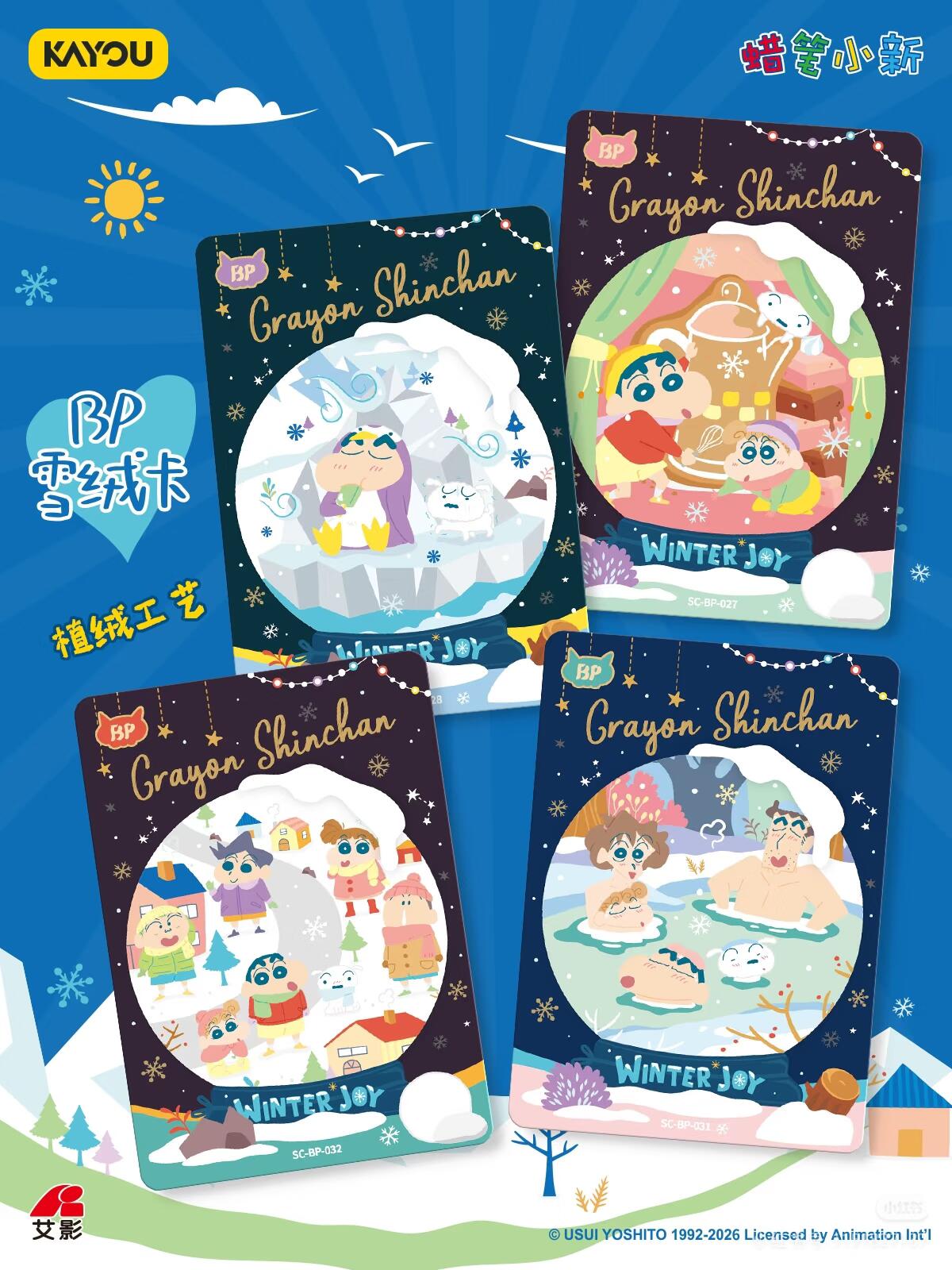 新”雪奇缘,温暖寒冬 和小新在温泉比赛争夺扭屁股大赢家! SP手绘卡收录隐藏款春日部防卫队,一起解锁新运势吧 BP雪绒卡采用植绒工艺,南方的小伙伴们也能摸到毛绒绒的积雪啦