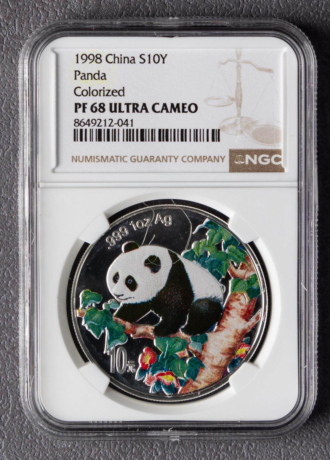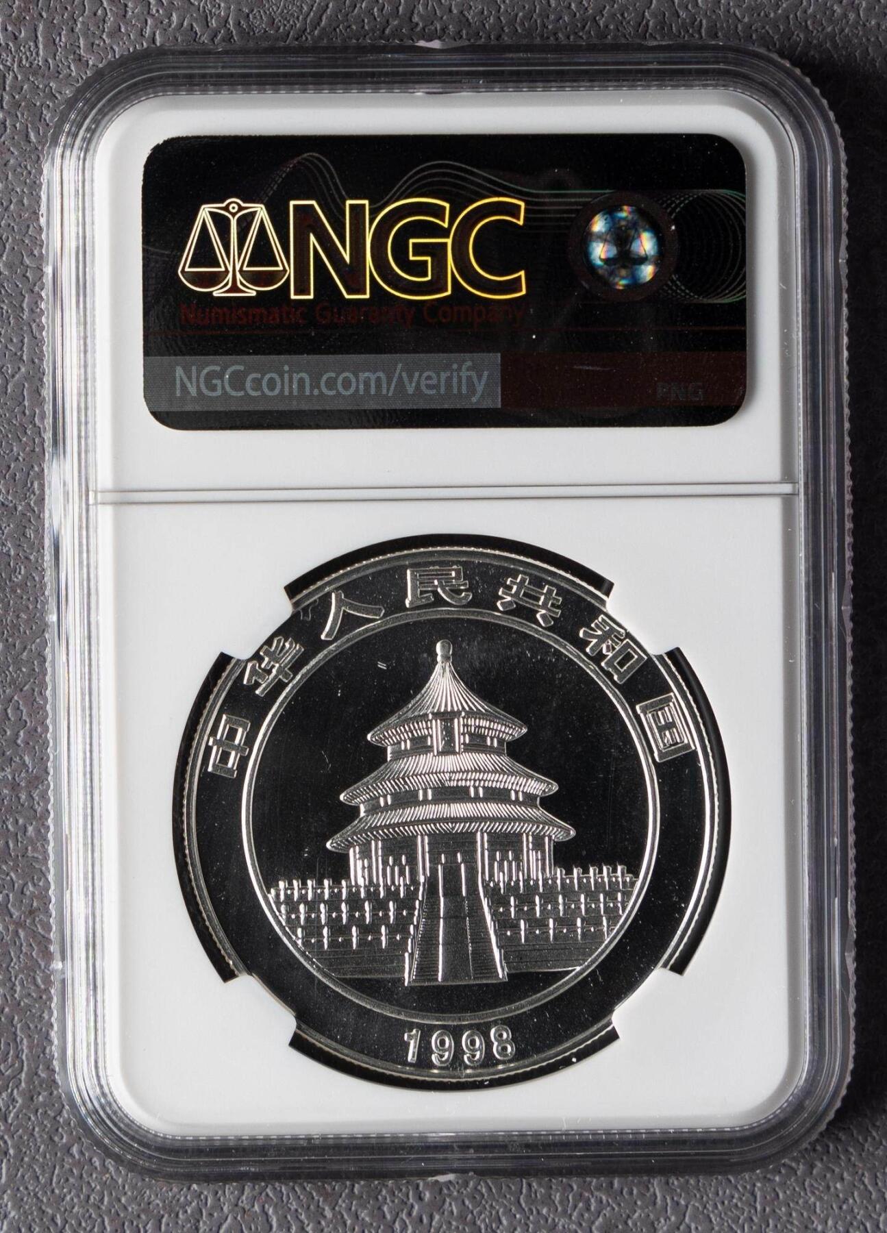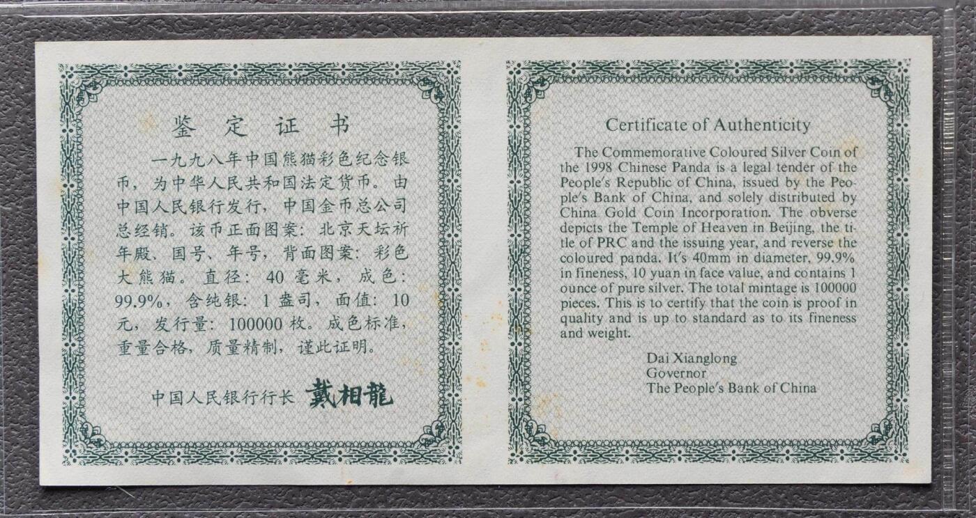 1. 材质规格:纯银1盎司(31.1035g),成色99.9%,直径40mm,面额10元;最大发行量100000枚 2. 图案:正面为北京天坛祈年殿,刊国名、1998年号;背面为彩色熊猫坐于花枝间图案,刊10元面额