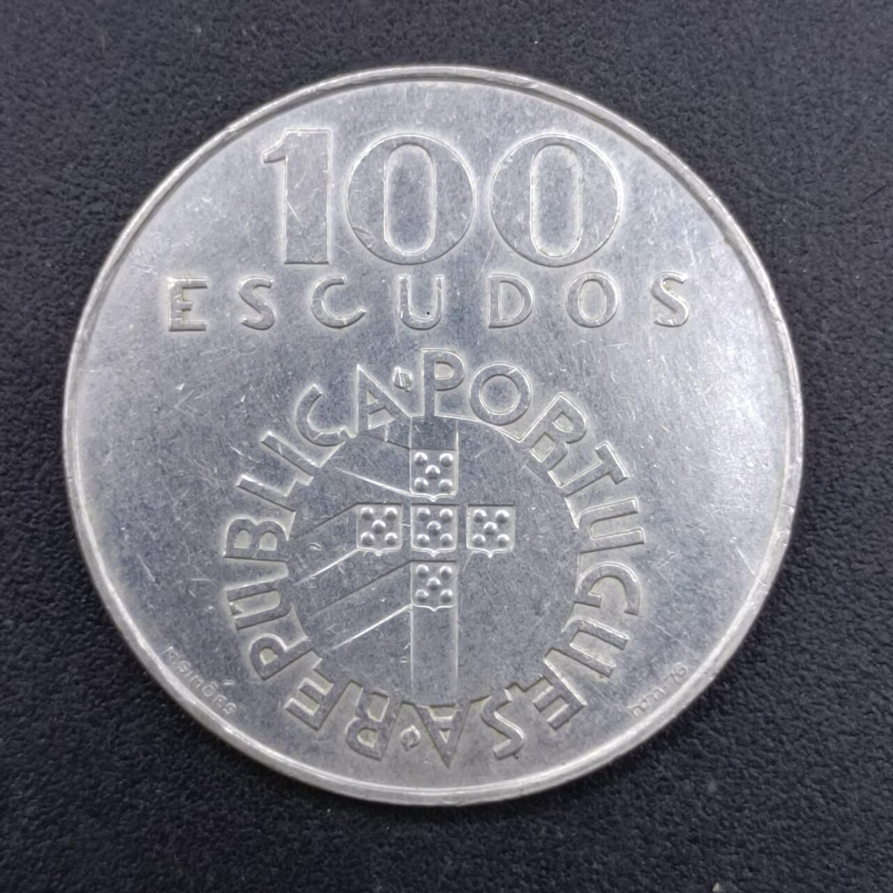 - 背面(图一):中央是葡萄牙国徽(带有五个盾牌的十字),上方是面值“100 ESCUDOS”,环绕着国名“REPÚBLICA PORTUGUESA”。