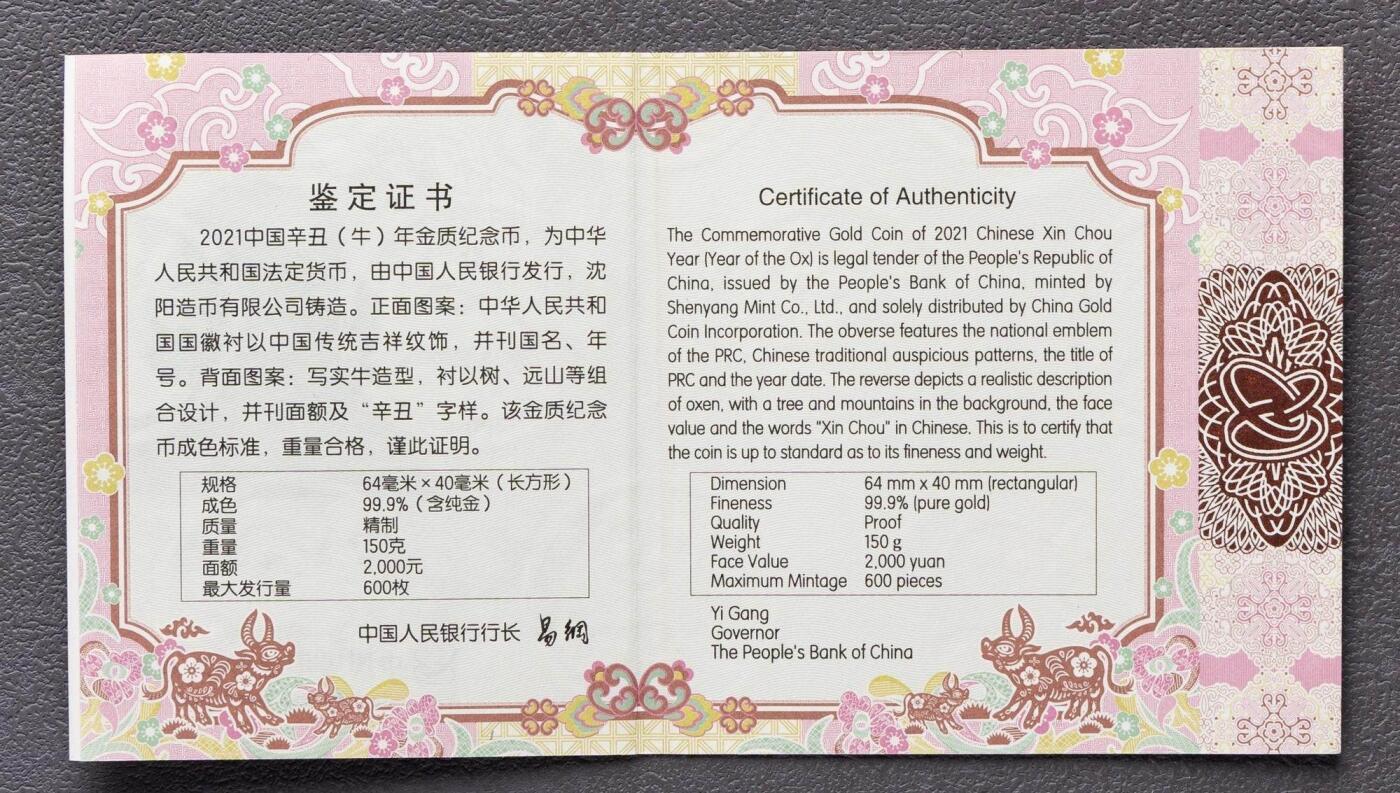 - 背面:写实风格的母子牛群造型,衬以古树、远山与祥云,刊“辛丑”字样及面额2000元,寓意勤劳坚韧、阖家安康