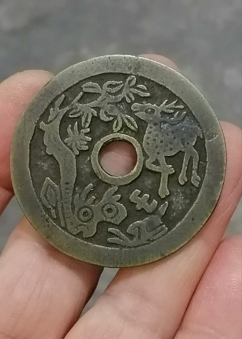 清代花钱一枚,长命富贵金玉满堂题材,背面小鹿吃桃 铜质厚重,直径45.7mm,厚3.1mm,重32.2g,华夏评级