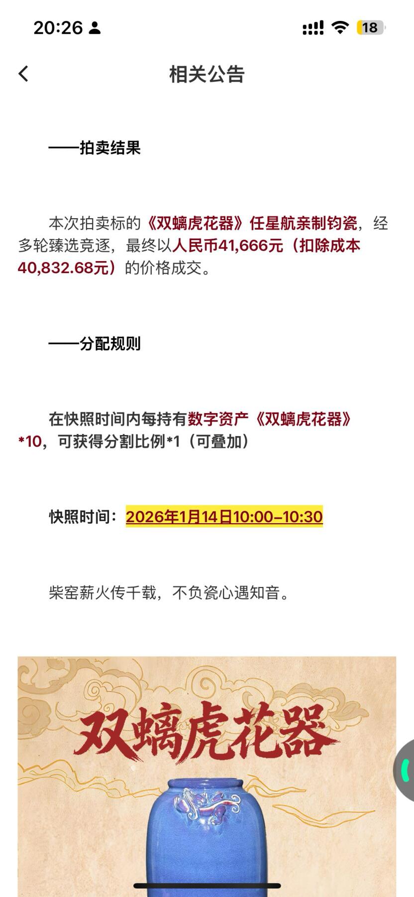当初拍卖的双离虎花器有收到拍卖分成的嘛 怎么拍卖了就没动静了