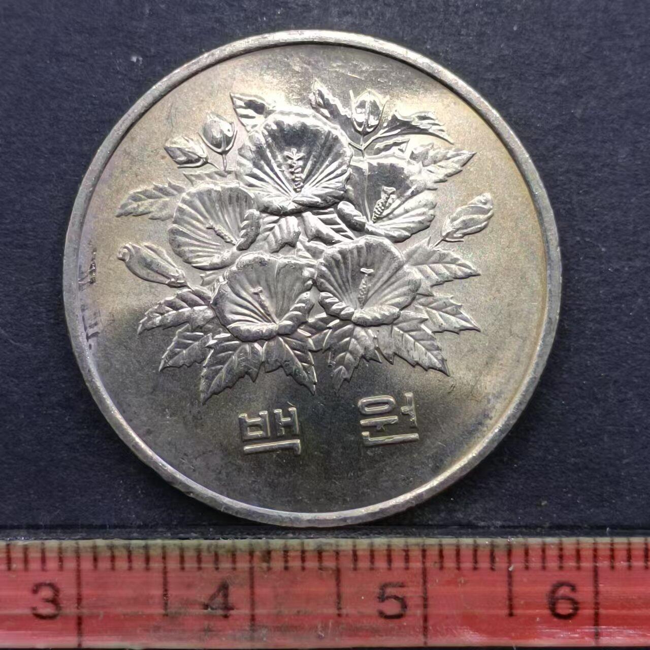 - 主体是韩国国花**无穷花(무궁화)**的花束图案,下方是面值“백원”(百圆)。无穷花象征着韩国的坚韧与繁荣。