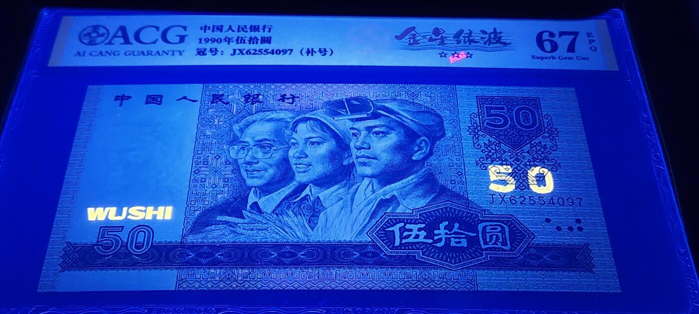 9050 JX金星绿波补号是第四版币中的稀缺荧光补号,存量极其稀少,票面正面人物背景在紫光灯下呈现满版金色荧光如璀璨金星,背面绿色底纹犹如大海波浪,荧光效果强烈、辨识度极高,是四版补号里的经典荧光版别。兼具补号稀缺性与金星绿波荧光特效双重价值,仅存于早期冠号中,收藏认可度高,是四版荧光币与补号收藏的珍稀品种,长期稳定保值,升值潜力强大。本品品相一流,绝中绝无油无斑无瑕疵。