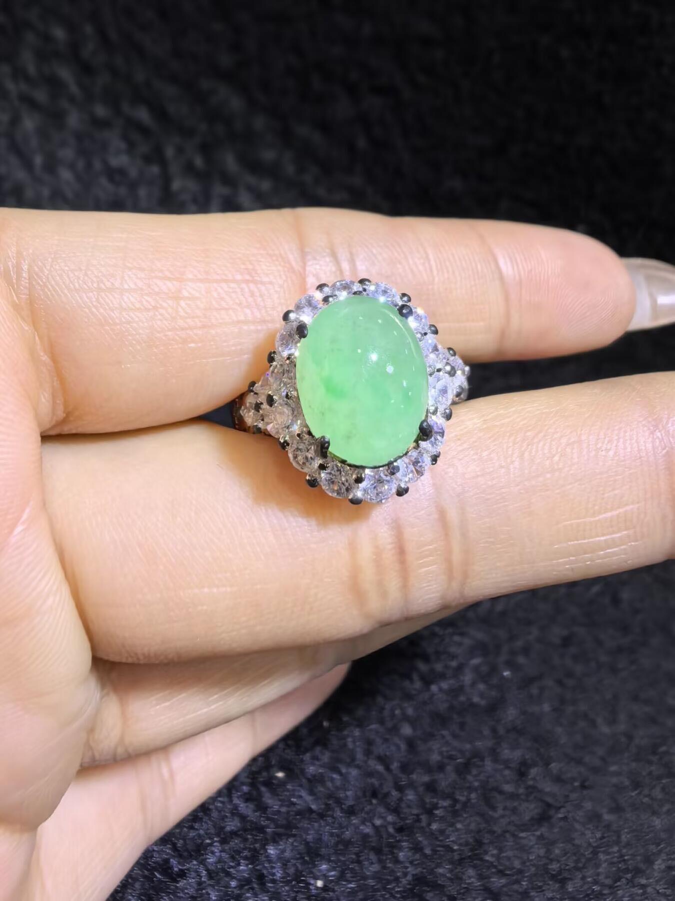 纯天然A货阳绿冰种女戒面,色泽浓郁,冰透水润,带色根,可代镶金银(老缅简单做铜托只为突显戒面效果)实物实拍,无任何滤镜,所见即所得。裸石尺寸:1.1cm*0.9mm
