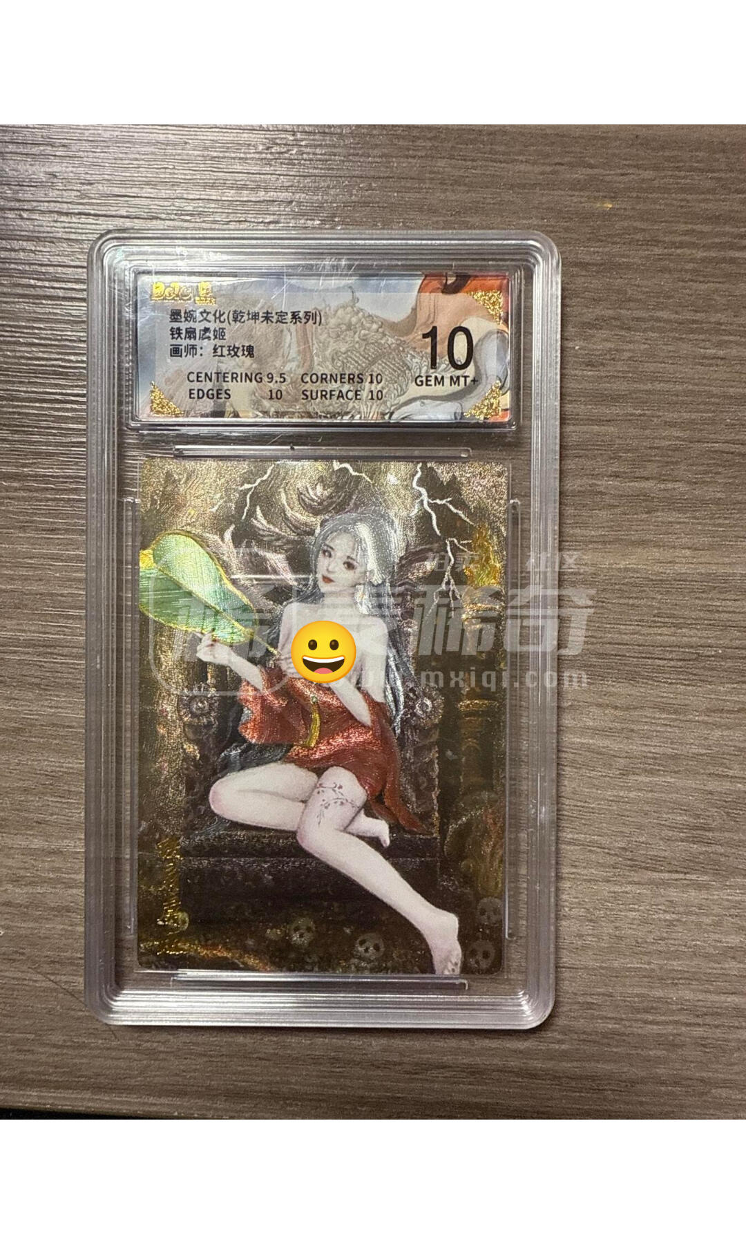 分享下墨婉文化的铁扇虞姬,画师:红玫瑰 墨婉文化的,铁扇虞姬,这张卡经常出现瑕疵,或者墨痕墨迹。卡到手了,一定检查我画圈这两个位置。经常有墨点或划痕,稍有不注意就中奖了。