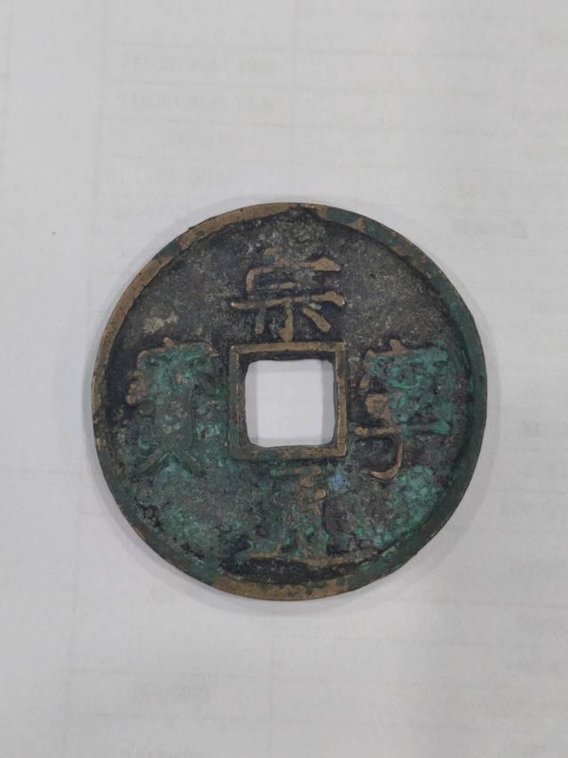 此钱锈色自然入骨,钱文风格和铸造工艺与真钱相符,鉴定为真品。此钱为崇宁通宝的普通品种,存世量较多,穿口有裂纹,影响品相。估价仅供参考