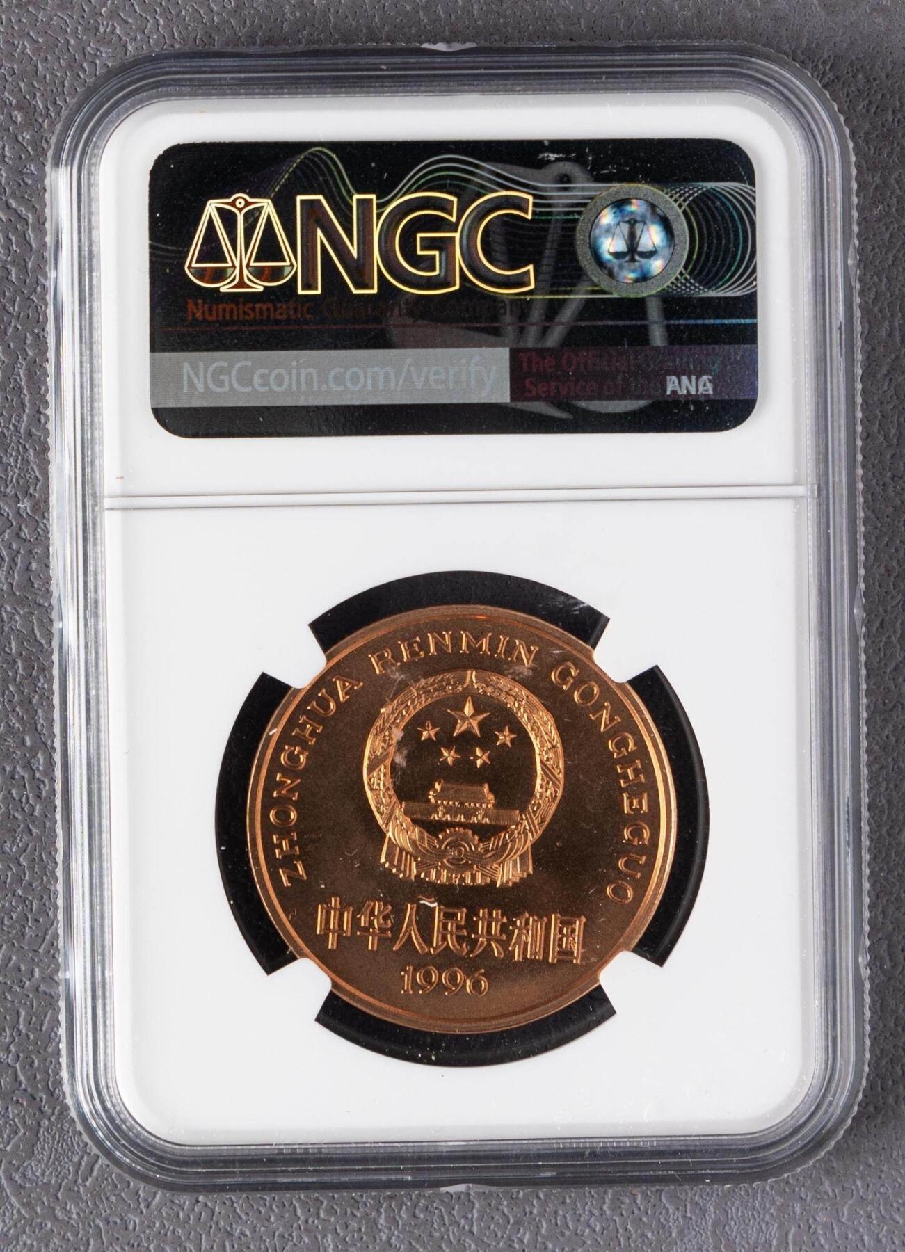 - 发行年份:1996年 - 面值:5元 - 材质:紫铜合金 - 规格:直径32mm,重量13.5g - 工艺:精制版(Proof-like),装帧量约2万枚,普制币发行量600万枚 - 评级信息:NGC MS68 RB PL - MS68:未流通状态,底板与图案细节保存完好,仅存在极轻微瑕疵 - RB:红铜色保留度高,仅存在轻微氧化或包浆 - PL:类精制镜面,底板具有明显光泽感