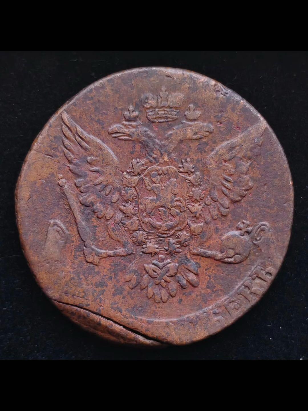 1723年6月28日沙皇彼得一世发布诏令,正式开铸铜5戈比,结束此前的银或低银合金为主的5戈比,1723年试铸,1724年批量流通,莫斯科卡达舍造币厂为主铸造,采用纯铜材质,直径32.5毫米,重量20.48克,边齿为网状纹。到伊丽莎白•彼得罗夫娜女皇时期,于1758年开始改版铸造超大铜5戈比,后世称“大铜5戈比”,到叶卡捷琳娜二世女皇时期(1767年开始),近一步标准化、增重、加大,1767年版重约37.4克,直径约42毫米,1779年版重约42.5克,1781年~1796年版重量51.2克,直径42毫米,铜质“车轮币”级大铜币。