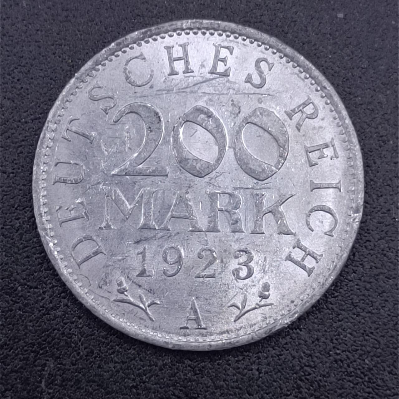 中央为大号面值 200 MARK,上方环绕国名 DEUTSCHES REICH(德意志帝国/魏玛共和国),下方标注年份 1923,字母 A 代表柏林造币厂,两侧饰有月桂枝。