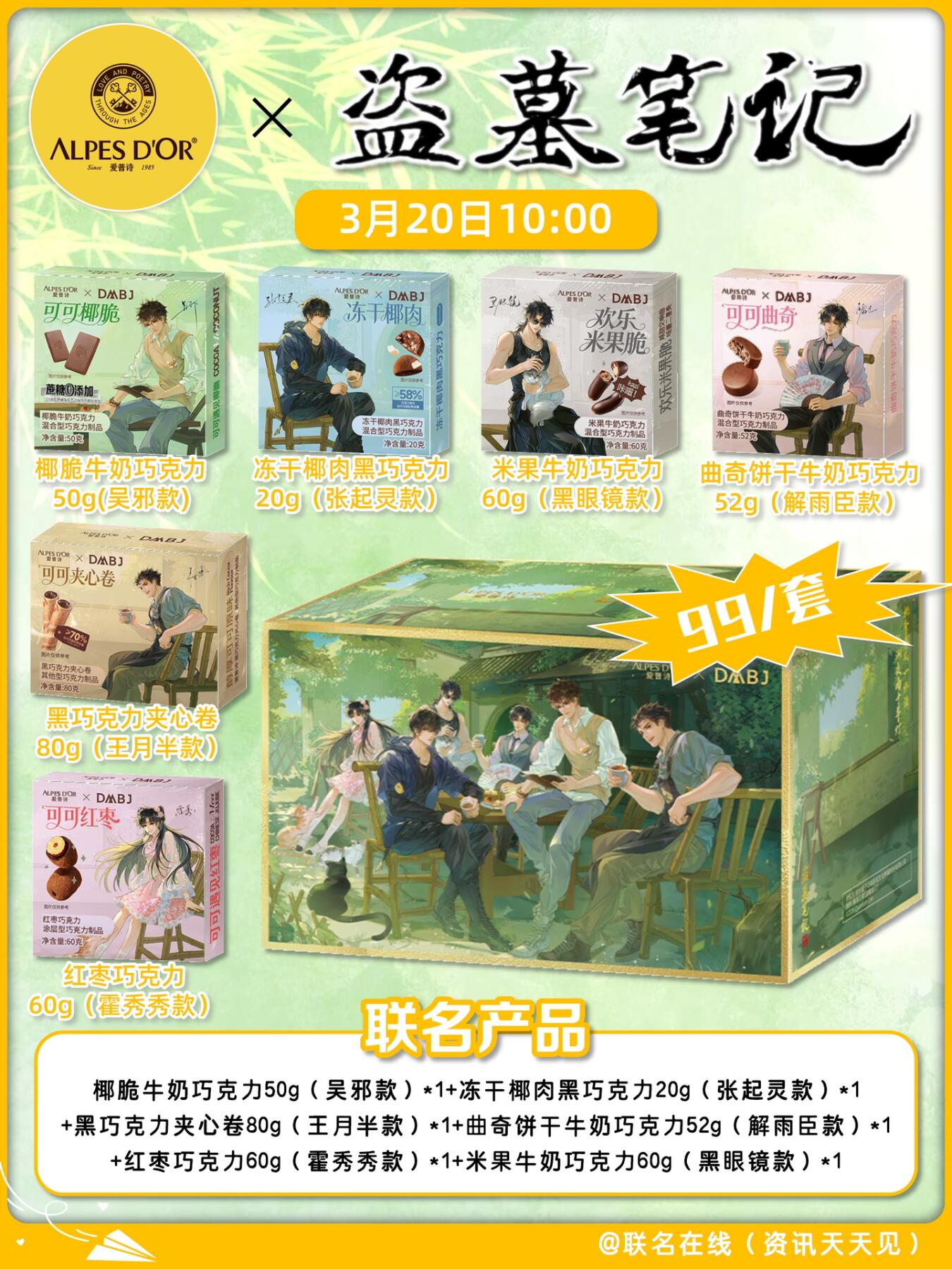 吴邪款椰脆牛奶巧🍃、小哥款冻干椰肉黑巧💙、王月半款黑巧夹心卷🧡、解雨臣款曲奇牛奶巧🌸、霍秀秀款红枣巧克力🍓、黑眼镜款米果牛奶巧🖤,每一款都颜值与口感双在线!
