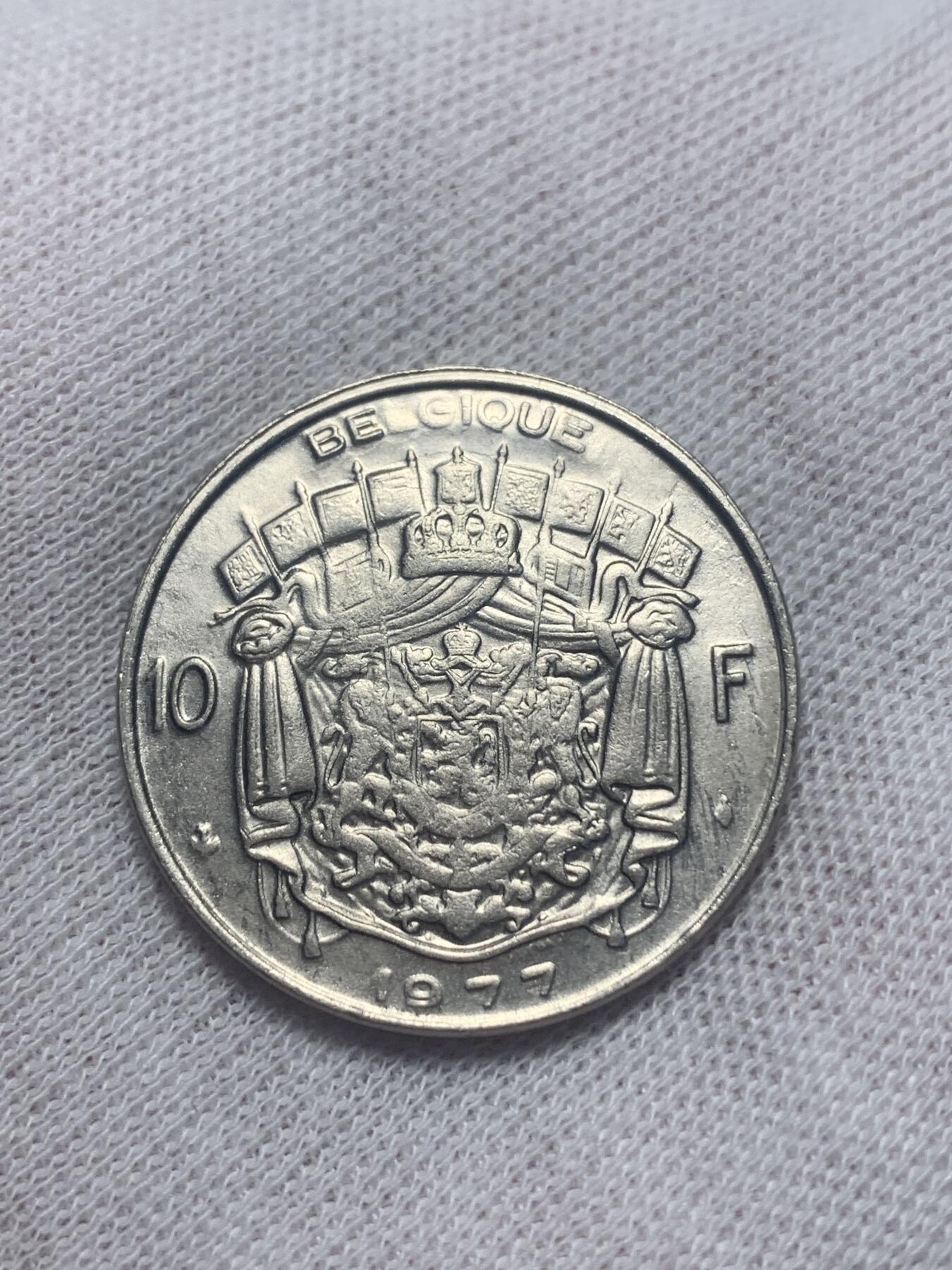 1977年比利时发行的10法郎流通镍币,正面为博杜安一世国王左侧头像,由设计师Harry Elstrom创作;背面是比利时国徽,标注面值“10F”与国名“BELGIQUE”。材质为纯镍,直径27毫米,重8克。