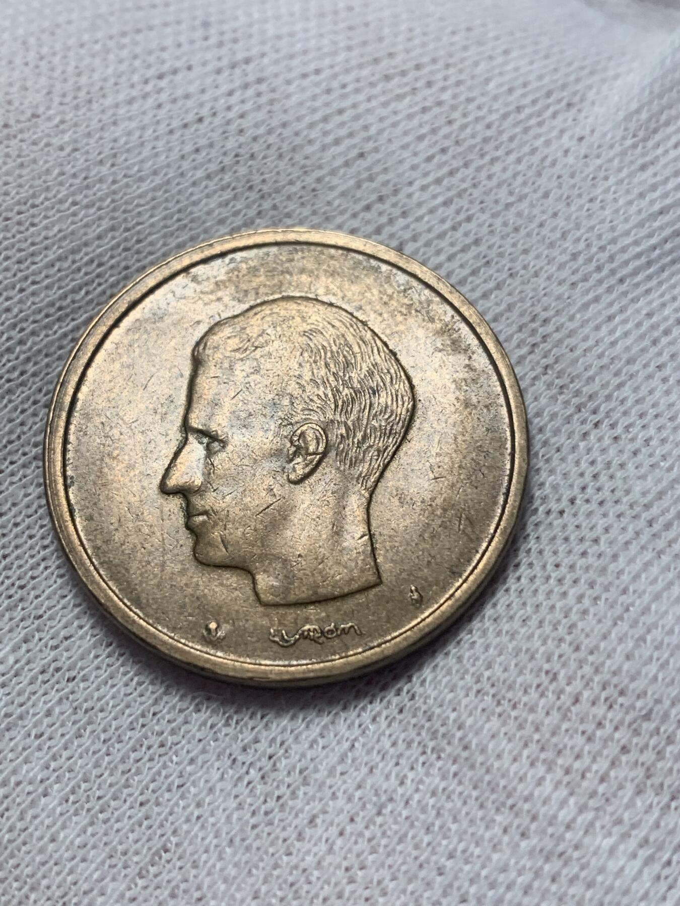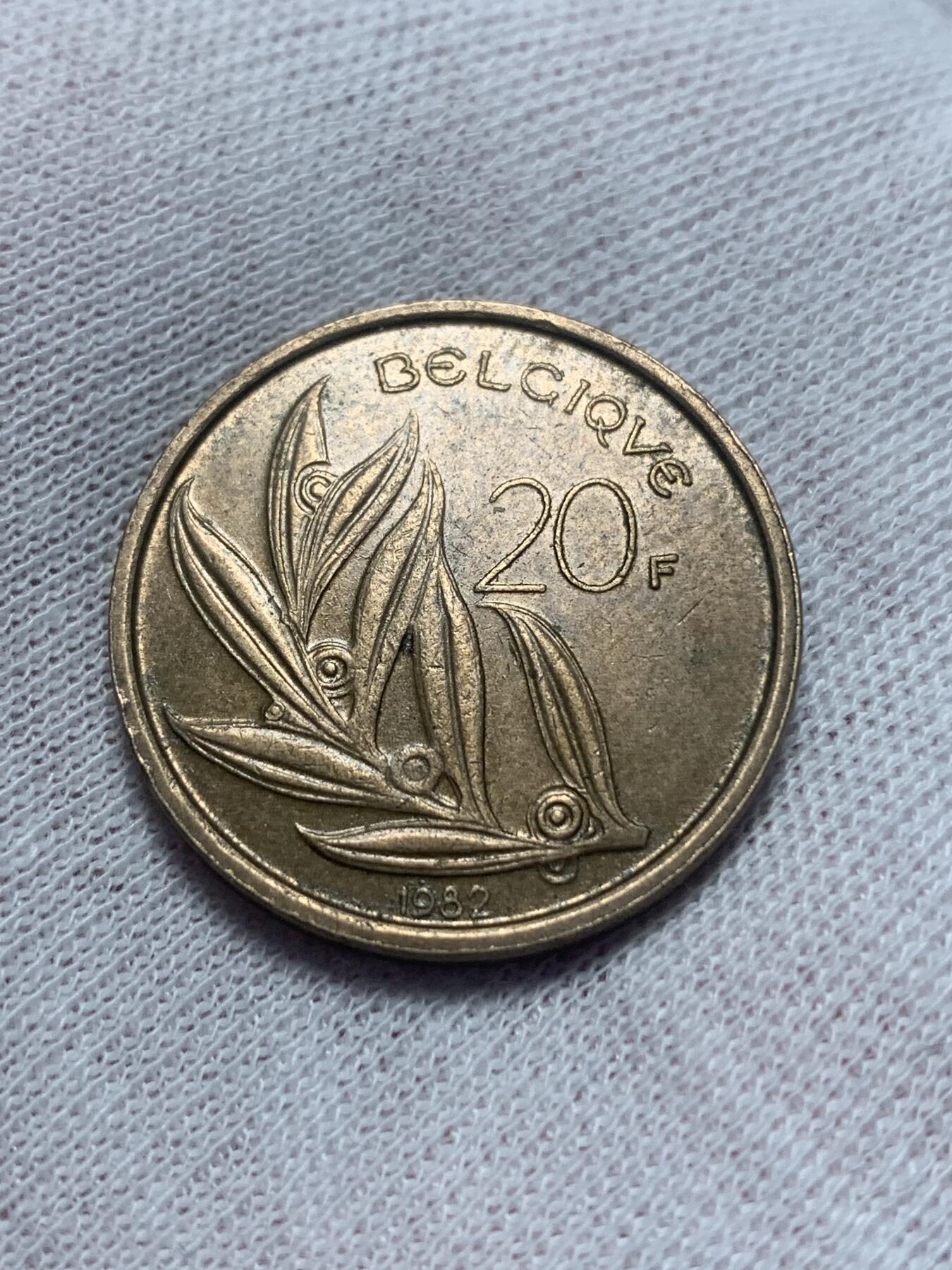 1982年比利时发行的20法郎流通铜币,正面为博杜安一世国王左侧头像,由设计师 Willy Luyckx 创作;背面为橄榄枝图案,标注面值“20F”与国名“BELGIQUE”,材质为铜锌合金,是比利时法郎时代的经典品种。
