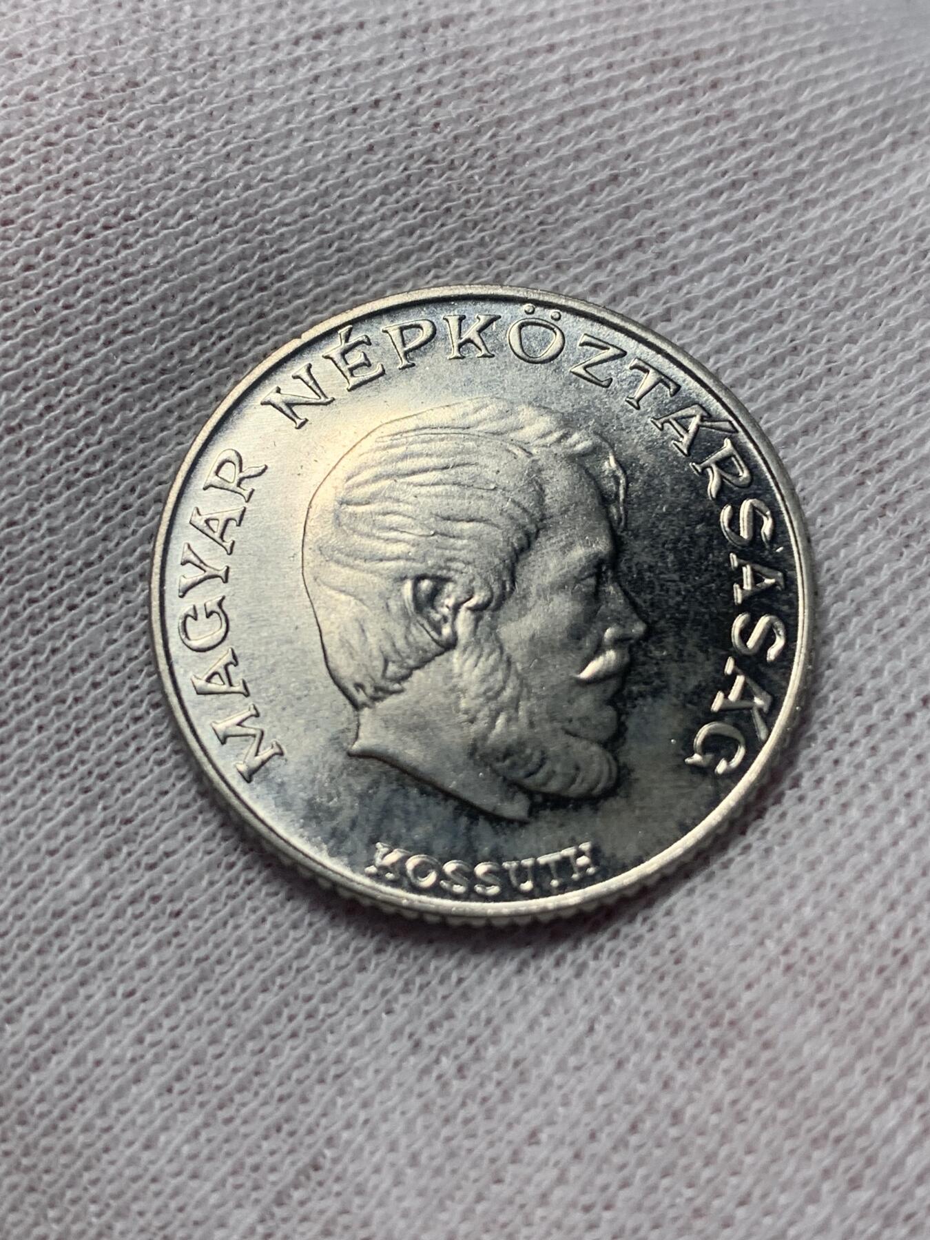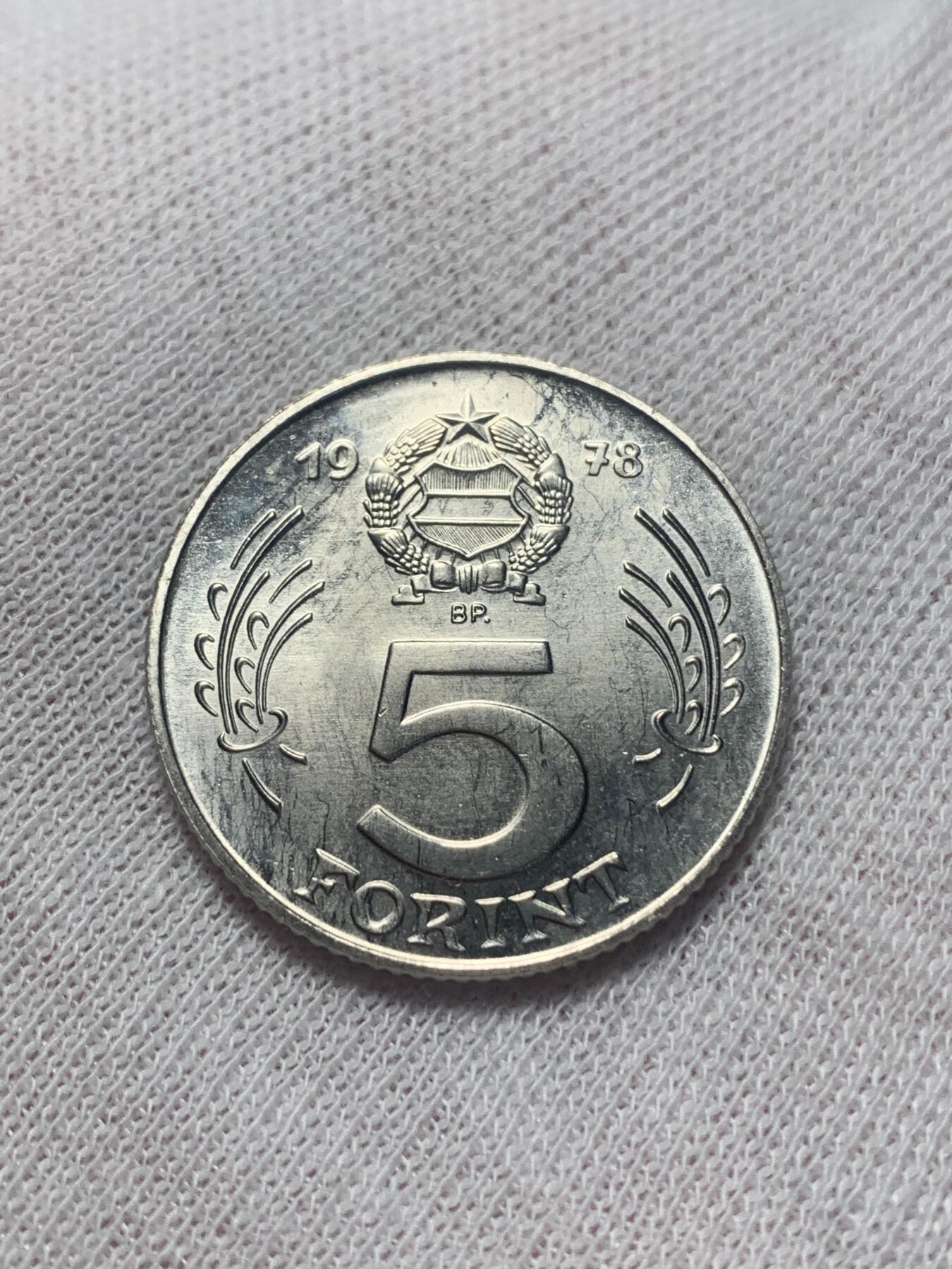 1978年匈牙利人民共和国发行的5福林流通镍币,正面为民族英雄科苏特·拉约什头像,背面是匈牙利国徽,标注面值“5 FORINT”与年份,材质为铜镍合金,是匈牙利社会主义时期的代表性流通币种。