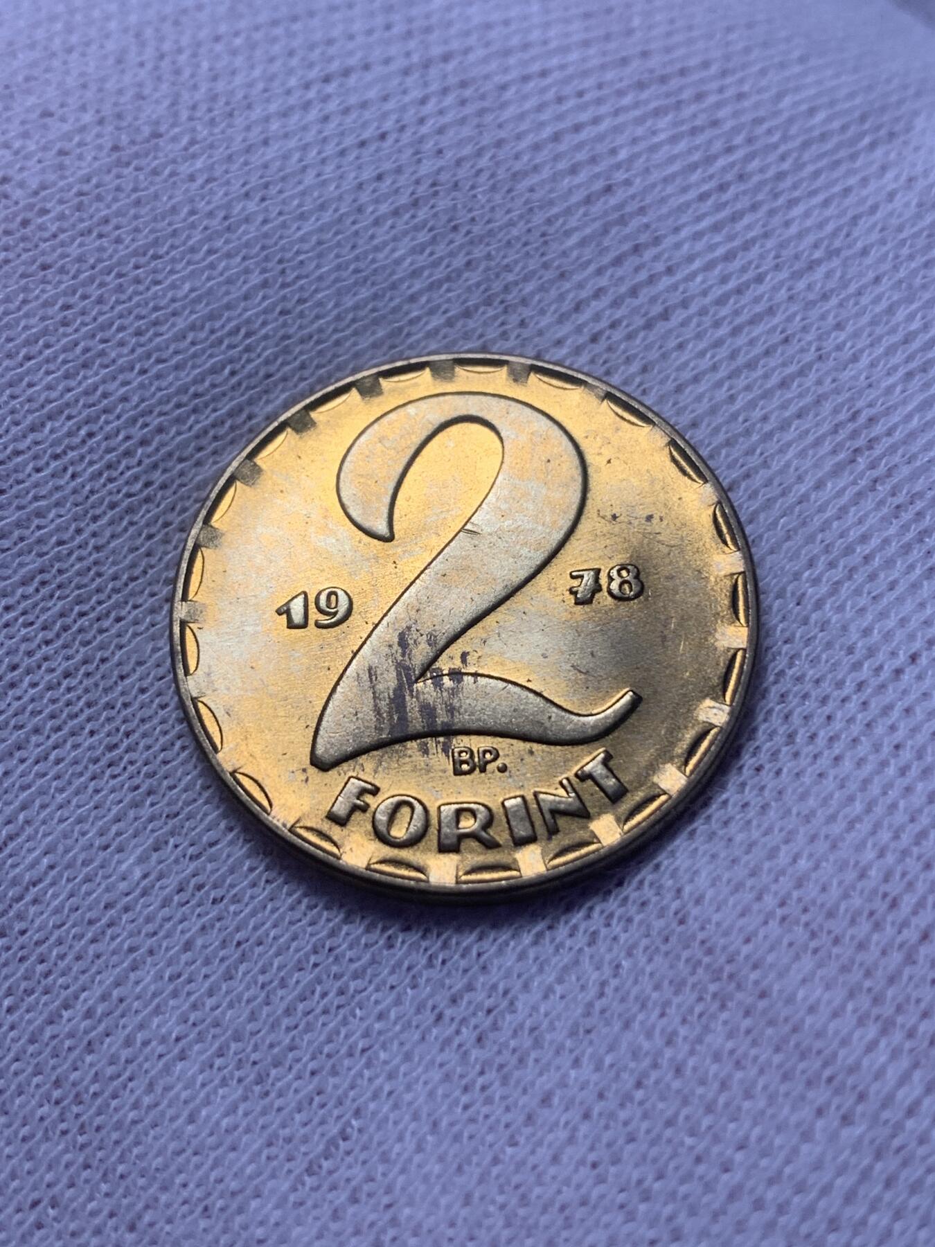 1978年匈牙利人民共和国发行的2福林流通铜币,正面为硕大的数字面值“2”,背面是带五角星的匈牙利国徽,外圈环绕国名“MAGYAR NÉPKÖZTÁRSASÁG”,边缘齿状装饰,材质为铜锌合金。