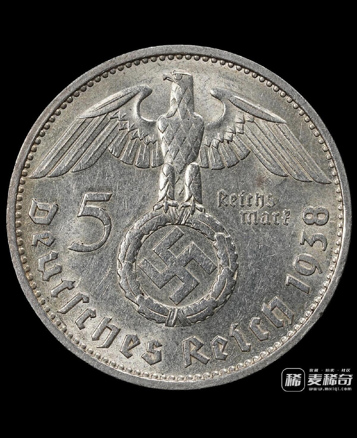 1938年德国兴登堡5马克银币 F厂铭,13.82g,含银90%,带光,少见的年份厂铭 兴登堡5马克,带万字是非常熟的一个品种了,以后要收一枚PCGS63分以上的留着!