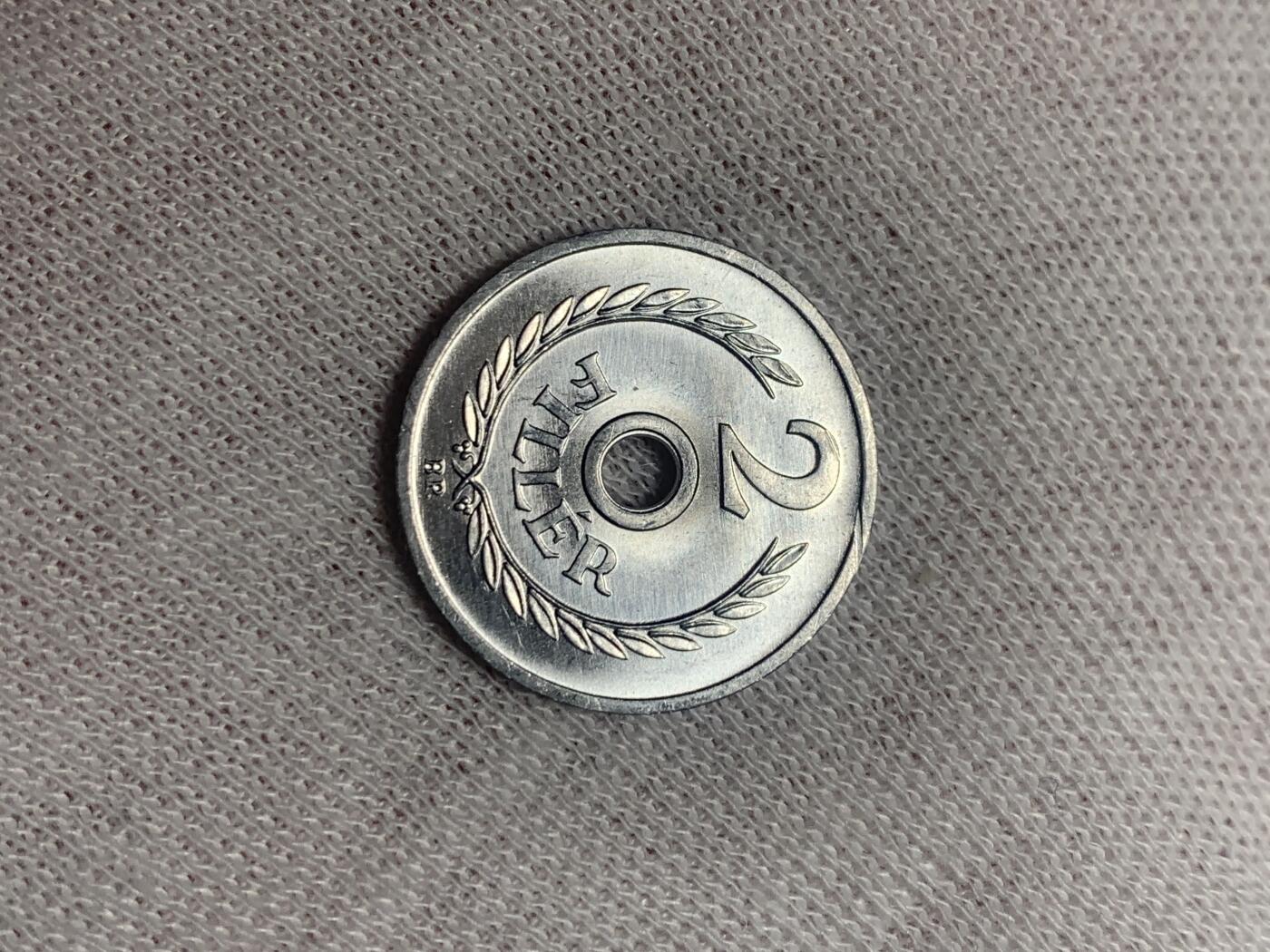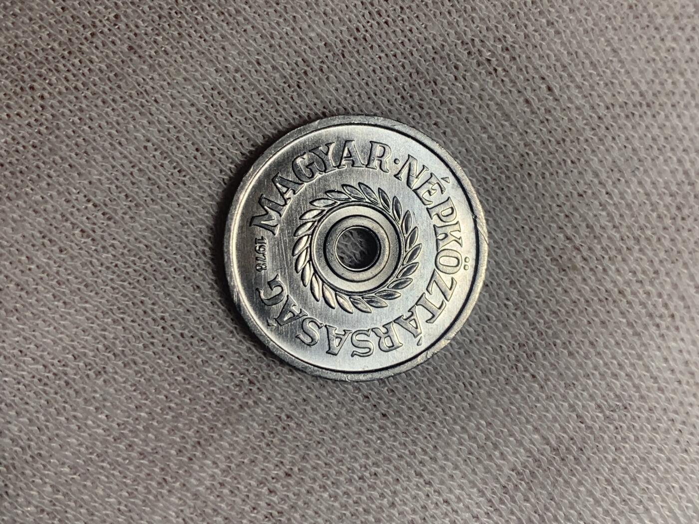 匈牙利1978年发行的2菲勒硬币,属匈牙利人民共和国时期流通币,材质为铝,采用中孔设计,正面刻有面值“2 FILLÉR”与月桂枝纹饰,背面铸有国名“MAGYAR NÉPKÖZTÁRSASÁG”及年份,现已退出流通。