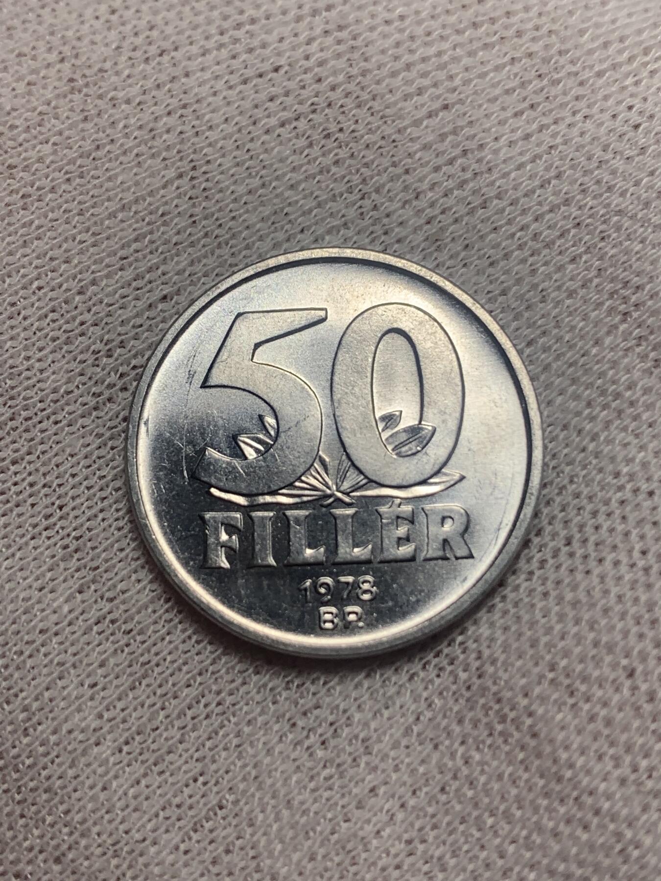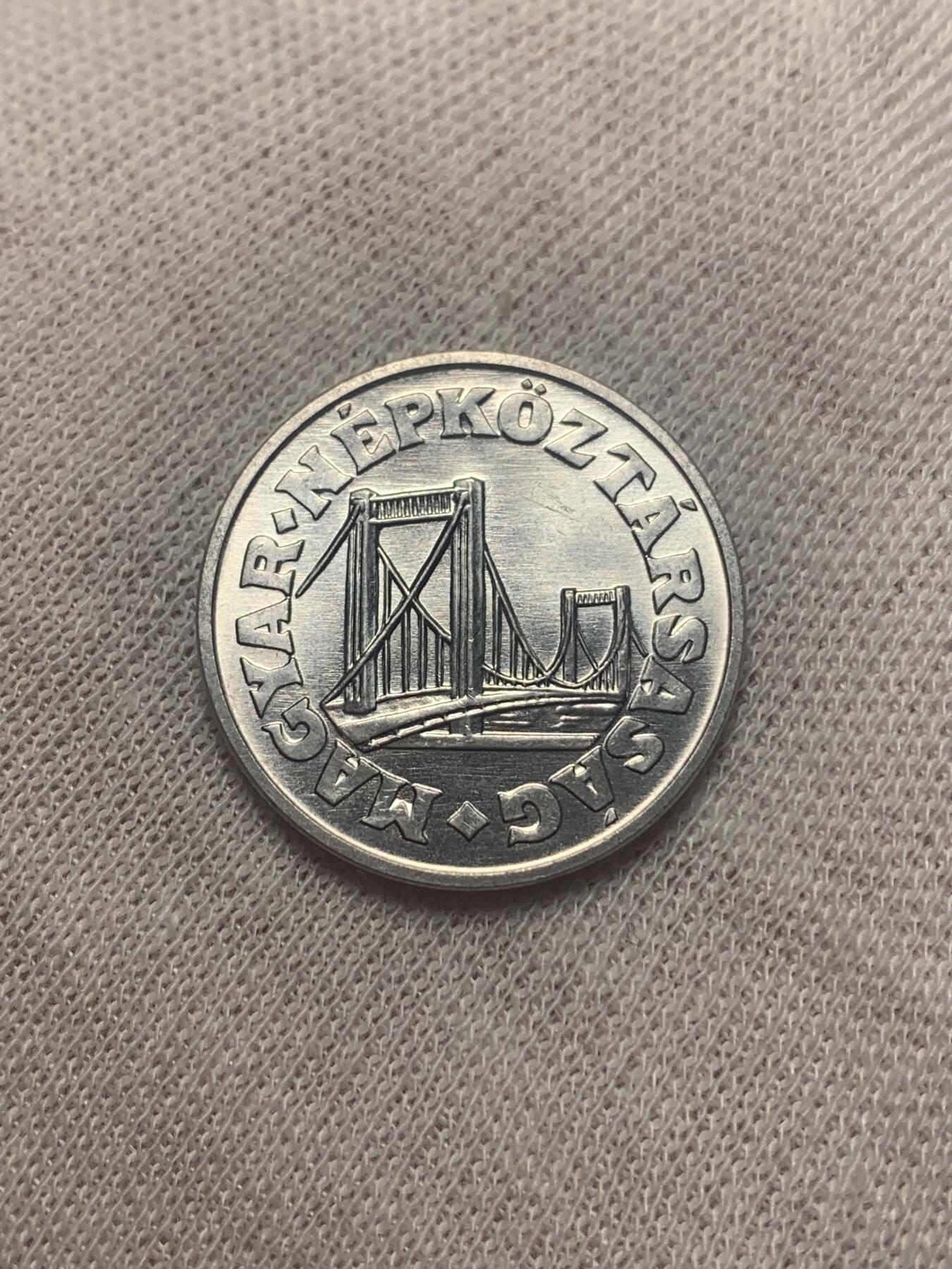 匈牙利1978年发行的50菲勒硬币,材质为铝。正面以大号数字“50”为核心,下方衬以月桂枝叶纹饰;背面刻有多瑙河链桥(布达佩斯标志性悬索桥)图案,兼具历史与收藏价值。