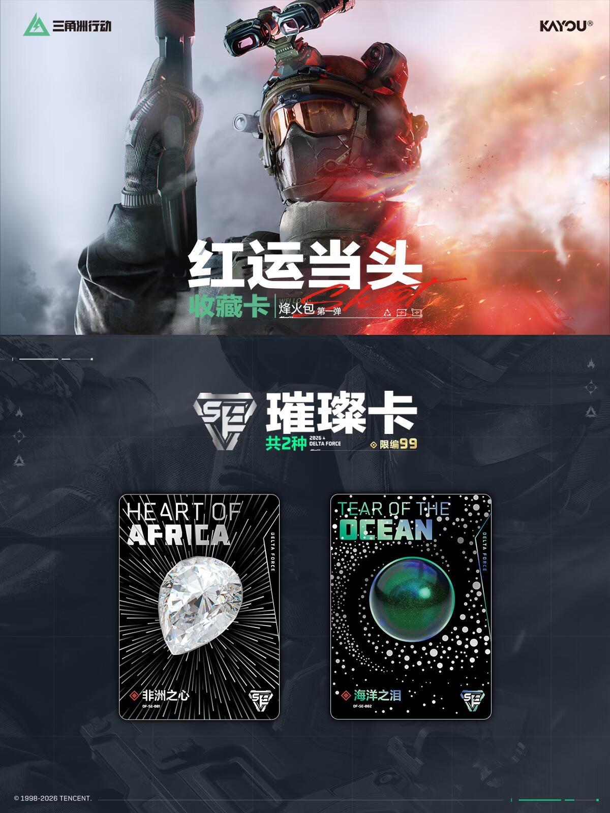 三角洲行动-红运当头收藏卡-烽火包-第1弹现已上市 SE璀璨卡收录大红物资素材:非洲之心&海洋之泪 ◇XR至臻卡则复刻红狼、骇爪的干员研究外观 XR卡面选用游戏中曼德尔砖开出的典藏枪皮 以及带有撕拉玩法的CR门禁卡、3D光栅工艺的HR激战卡、欢乐玩梗的R喷漆卡等,静候各位干员的到来 #卡游 #卡游情报 #三角洲行动 #三角洲行动卡牌