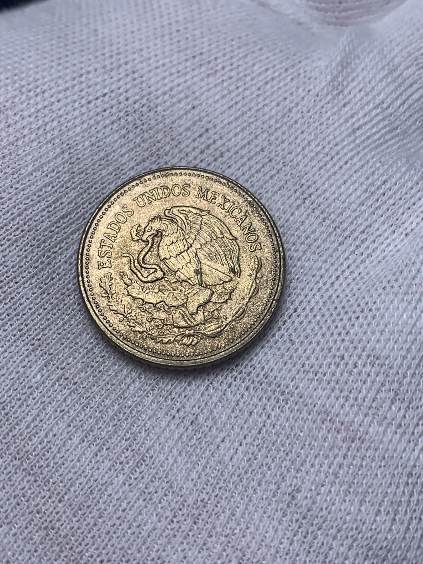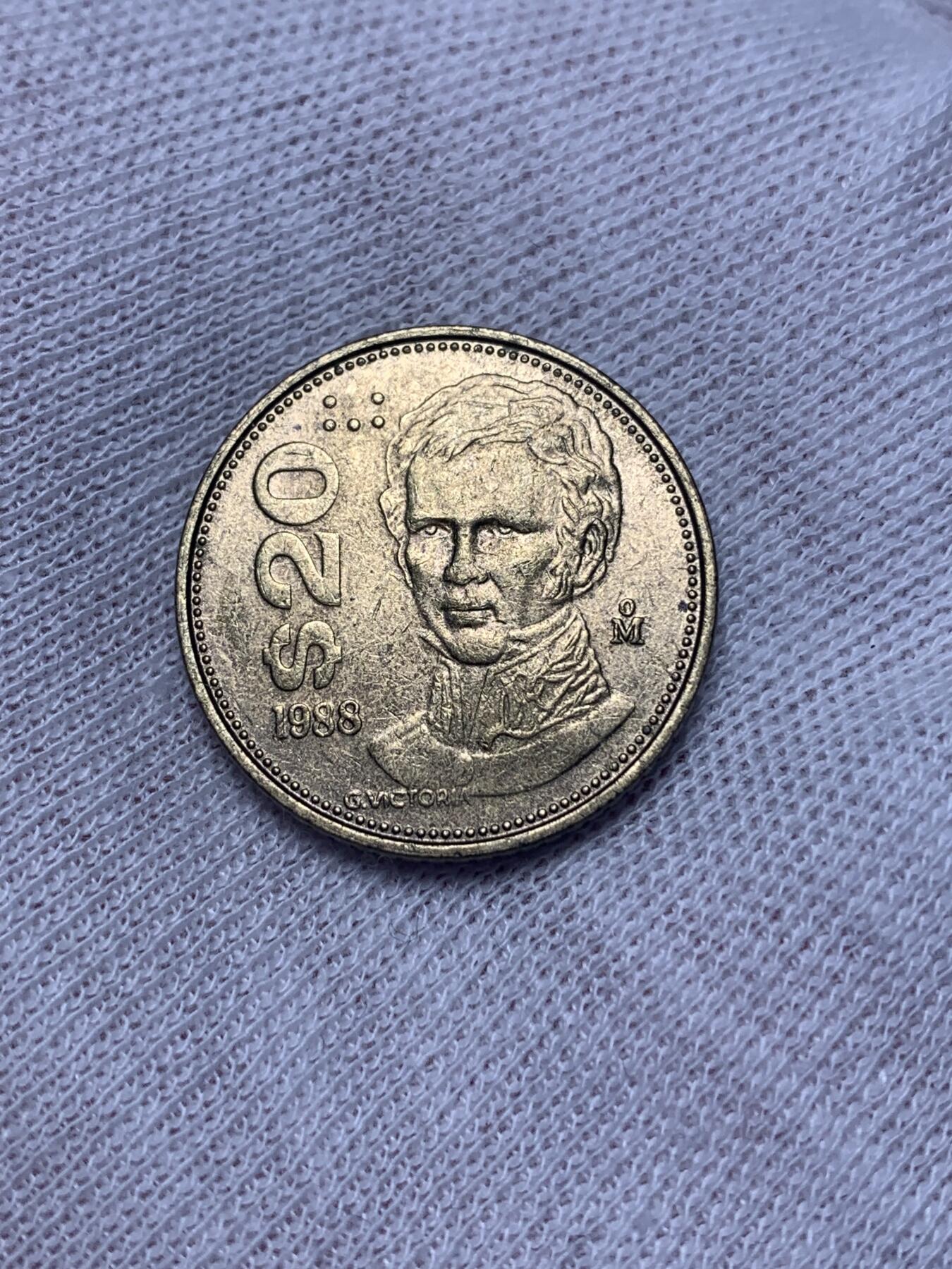 1988年墨西哥发行的20比索,黄铜材质。硬币正面印有墨西哥首任总统瓜达卢佩·维多利亚的头像,背面则是墨西哥国徽图案,雄鹰抓着蛇站立在仙人掌上。