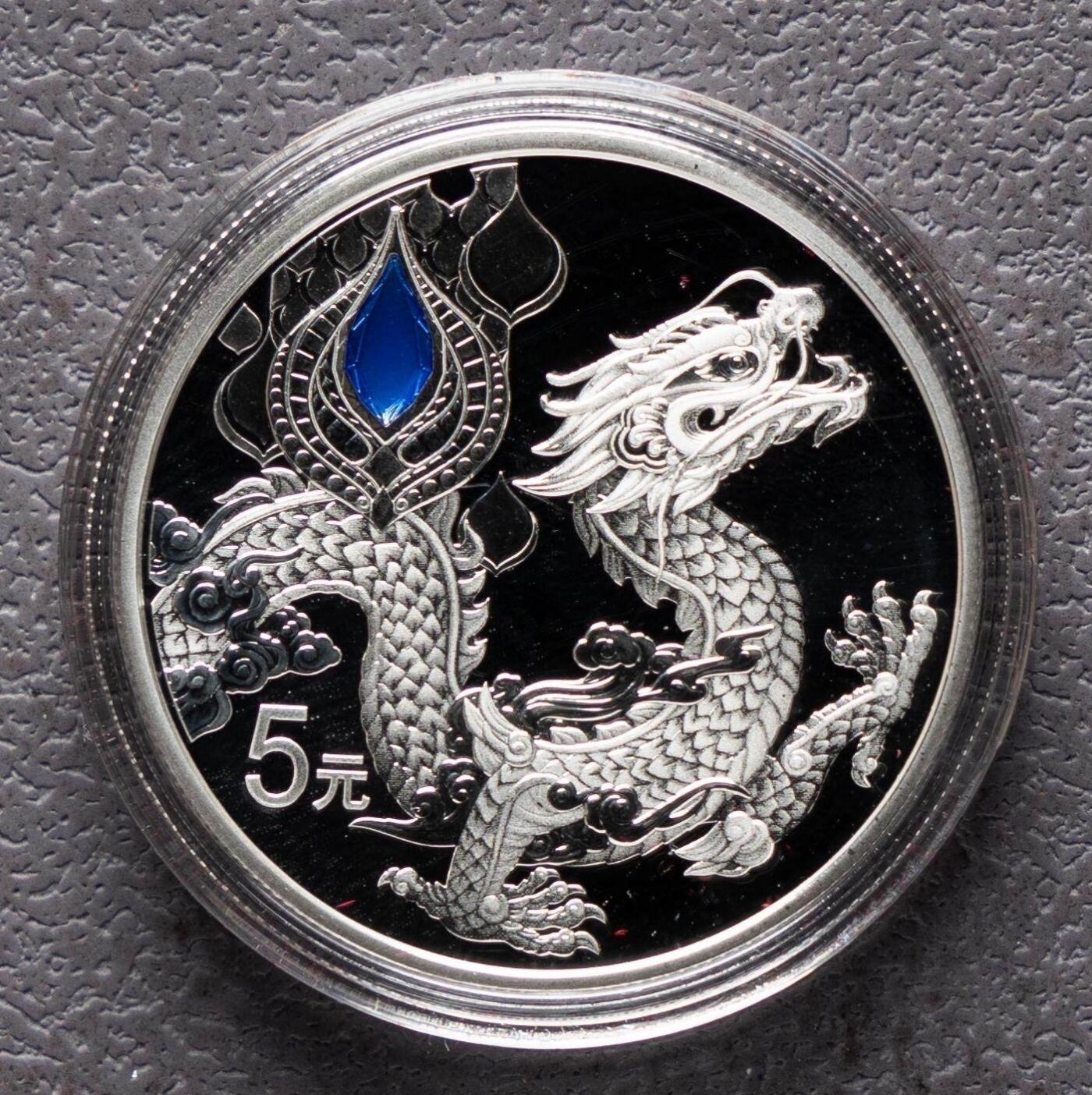 - 背面:主图案为中华传统神龙造型,辅以云纹、镶嵌式蓝色仿宝石装饰,刊“5元”面额,龙纹细节刻画精细,鳞片、龙须、龙爪工艺立体