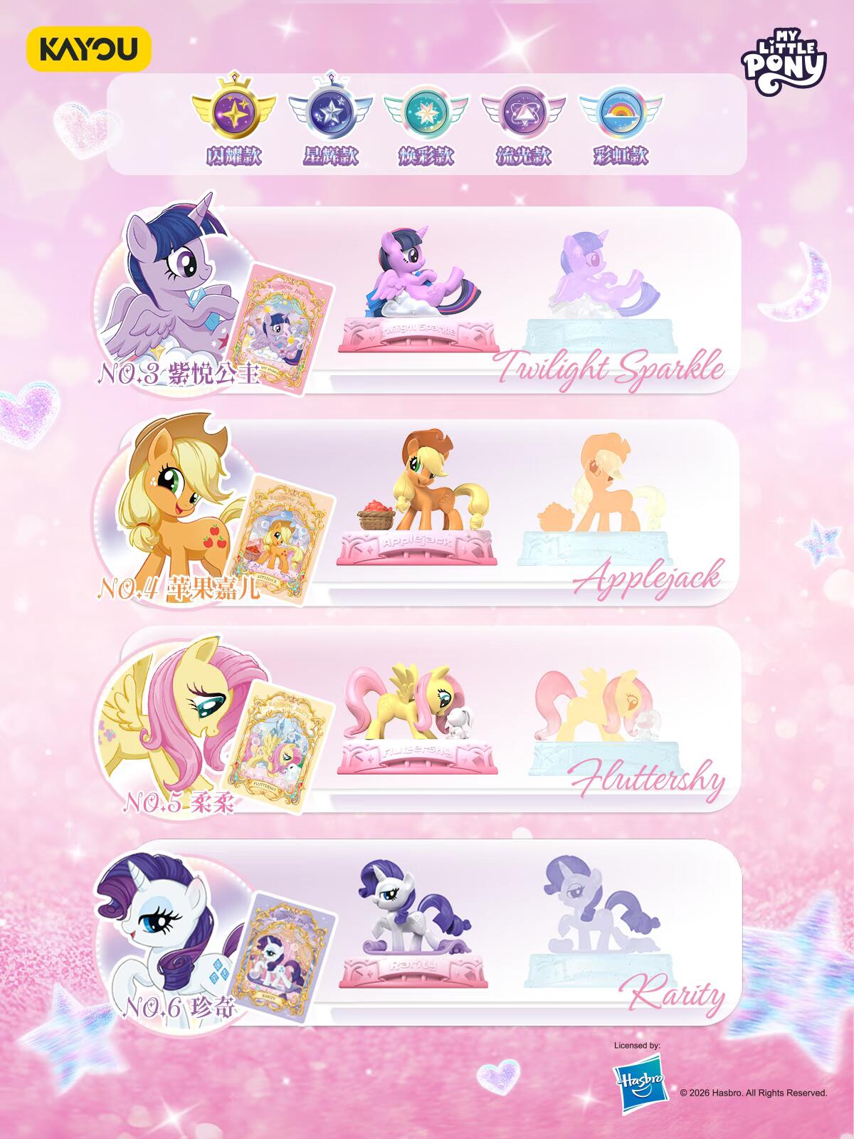彩虹派对!小马宝莉魔法橡皮人偶上新 卡游 小马宝莉魔法橡皮人偶 第3弹 即将正式上线! 新升级颜色配方,隐藏款首次全彩涂装,普通款降低单色小马比例,更加还原小马色彩。 六隐藏双配色,集齐隐藏还可搭建双层旋转台,动手DIY你的彩虹乐园吧。 隐藏款云宝&碧琪均配有背板,还有更多自由玩法等你解锁~ #卡游 #卡游情报 #小马宝莉 #小马宝莉魔法橡皮人偶 #小马宝莉周边 #卡游小马宝莉