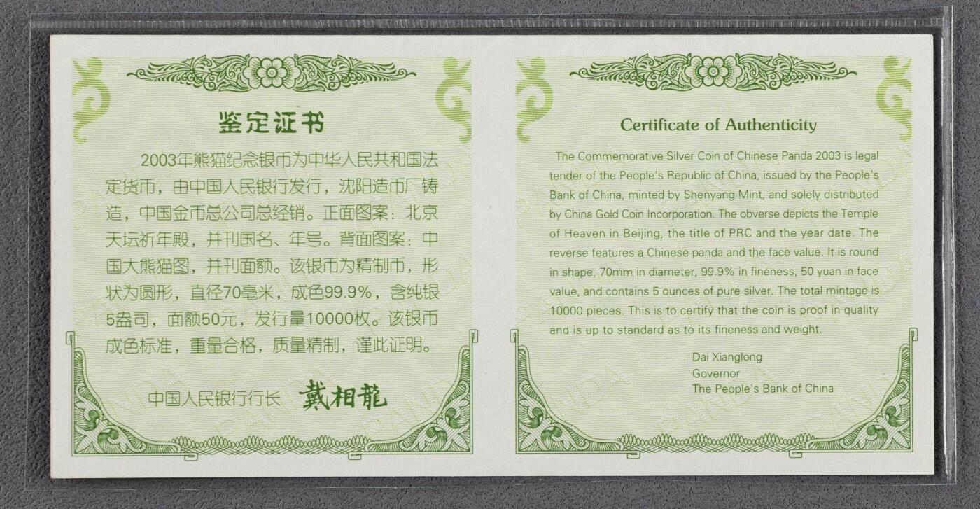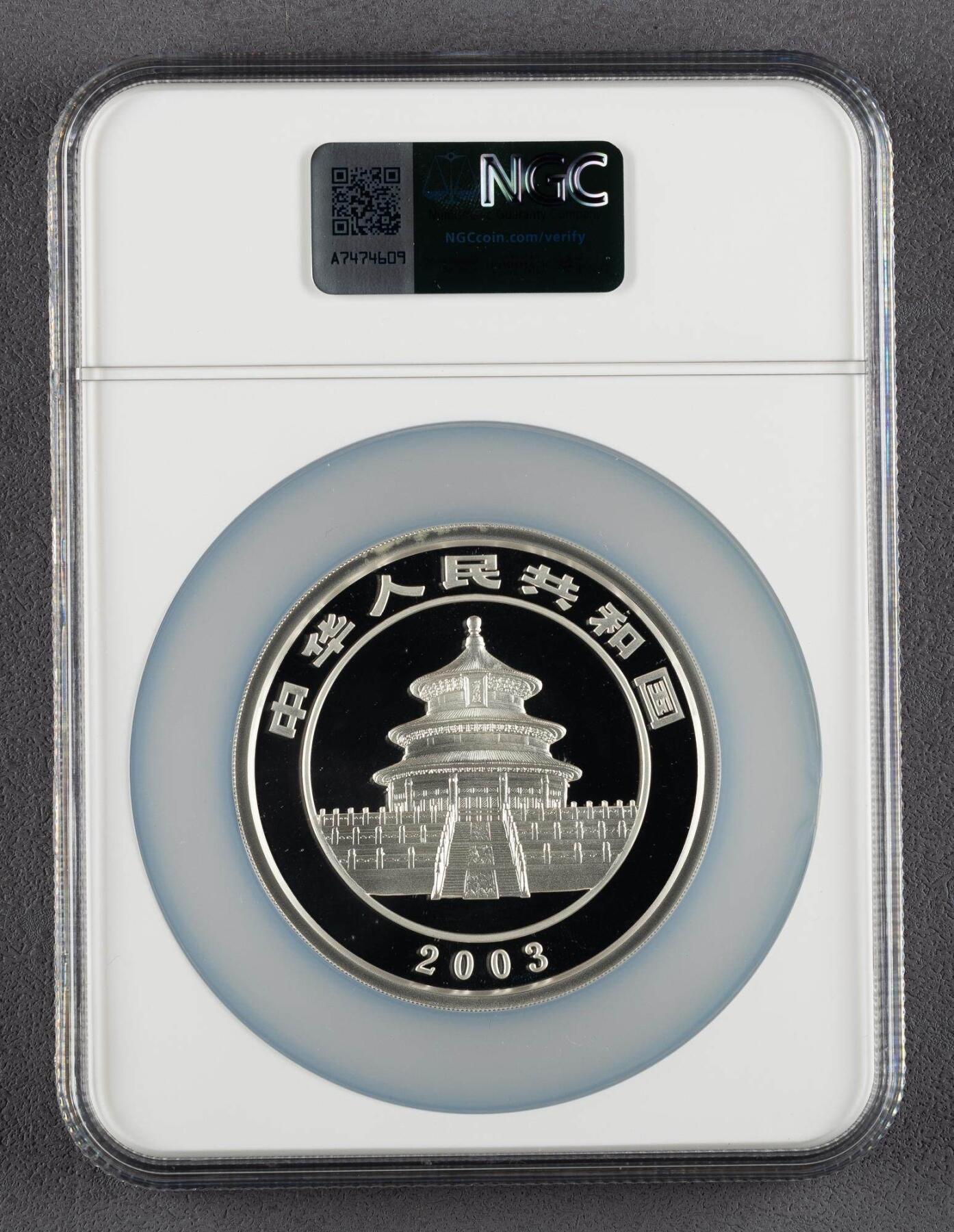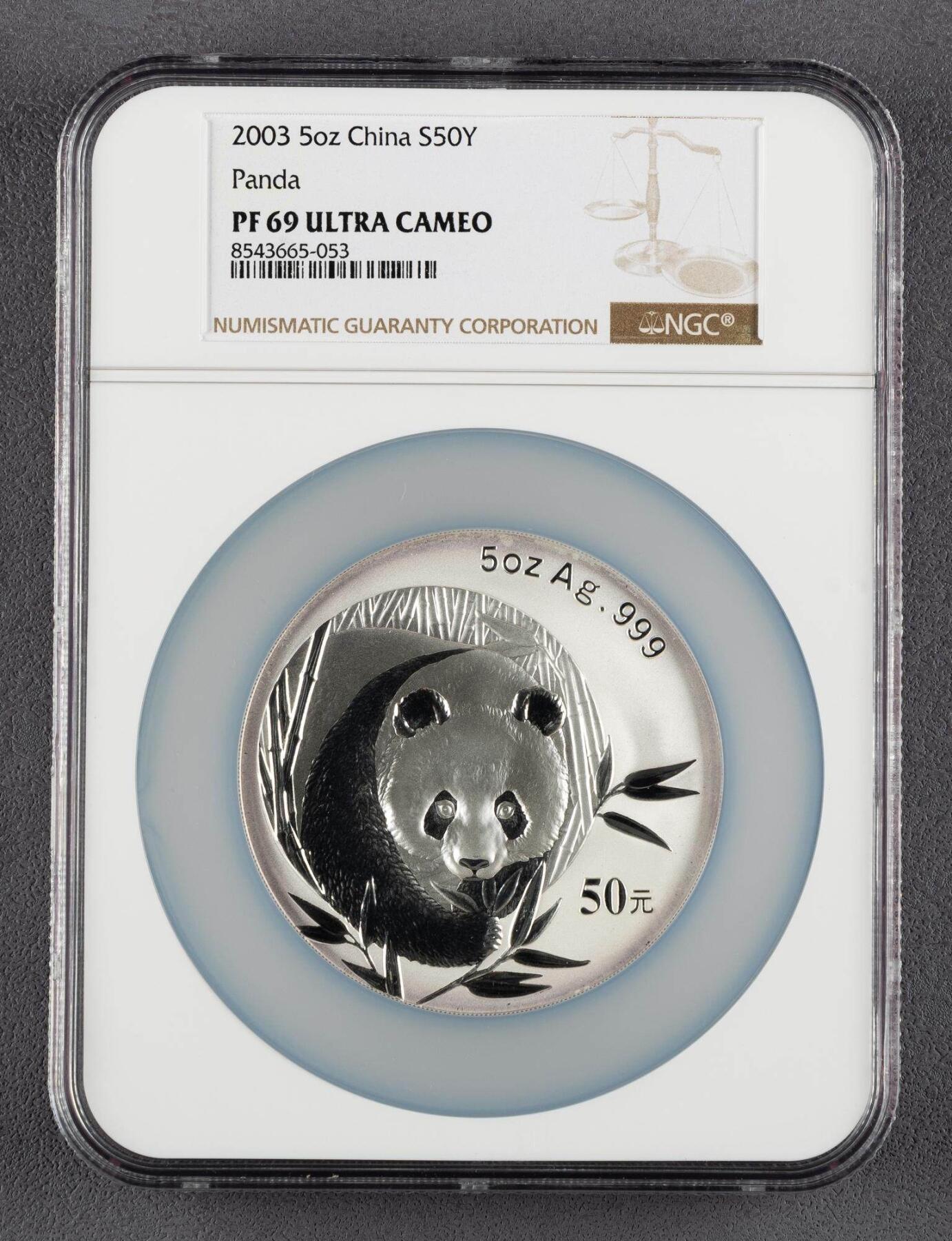 发行年份:2003版(2002年12月发行) 材质/成色:99.9%纯银(Ag.999) 重量:5盎司(约155.52克) 面额:50元(法定货币) 直径:70毫米 形状:圆形精制币 铸造单位:上海造币厂、沈阳造币厂、深圳国宝造币厂 正面图案:北京天坛祈年殿,刊国名、年号 背面图案:蜷卧竹林的熊猫,刊“5oz Ag.999”、面额50元 评级信息:NGC PF 69 ULTRA CAMEO 发行量:1100枚