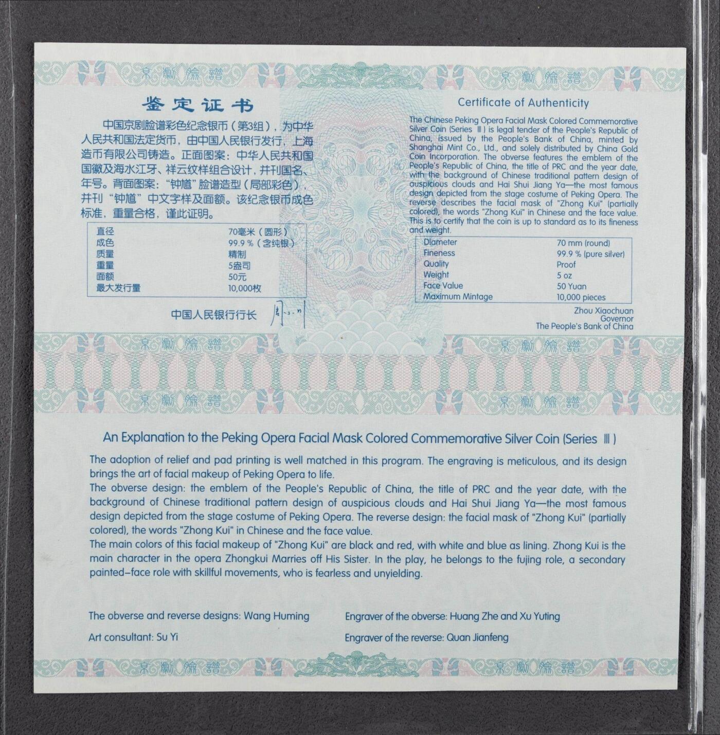 - 发行背景:该币为中国京剧脸谱彩色金银纪念币(第3组)中的5盎司大规格精制银币,是京剧文化题材贵金属纪念币的核心品种