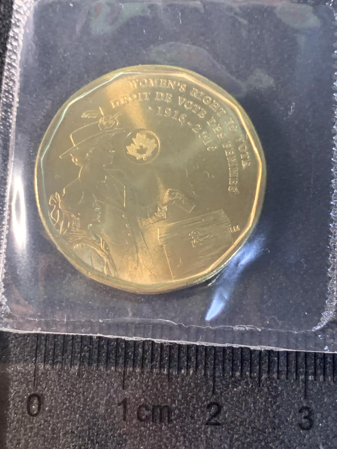 2016年加拿大1加元纪念币,11边形镀黄铜钢材质。正面为伊丽莎白二世头像,背面刻画女性投票场景,旁有女孩注视,配枫叶防伪标记。