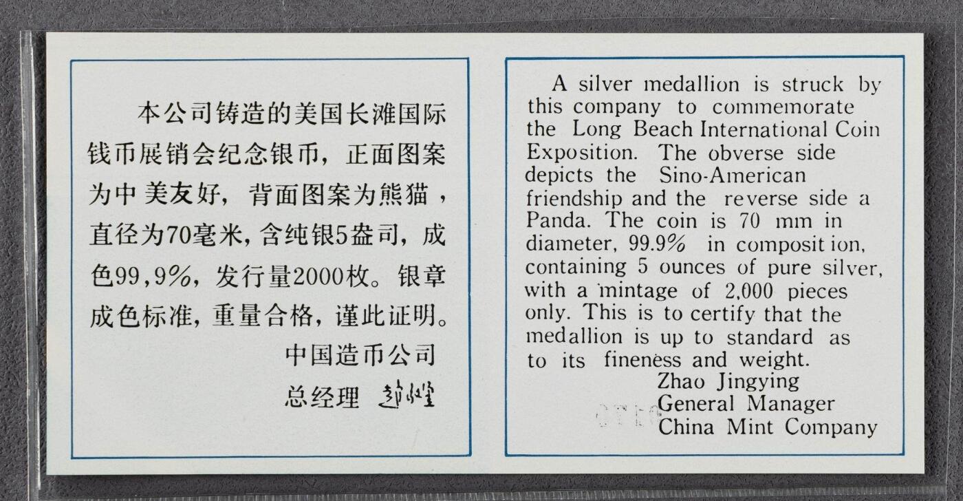 - 发行背景:为1987年美国长滩钱币邮票展发行的官方熊猫主题纪念银章,是早期熊猫贵金属纪念章中的经典品种,属于海外展纪念系列,兼具收藏与投资属性。