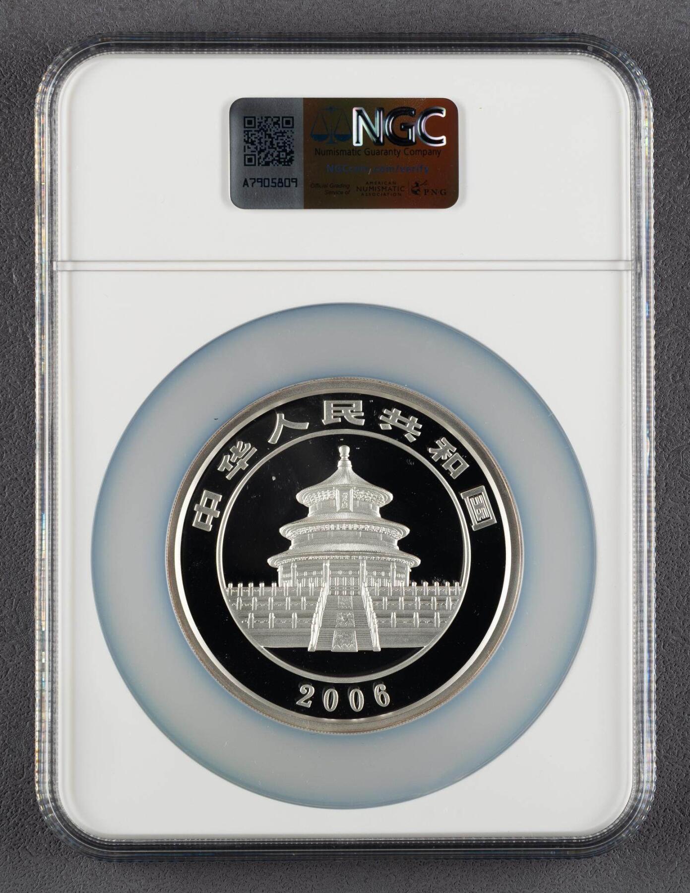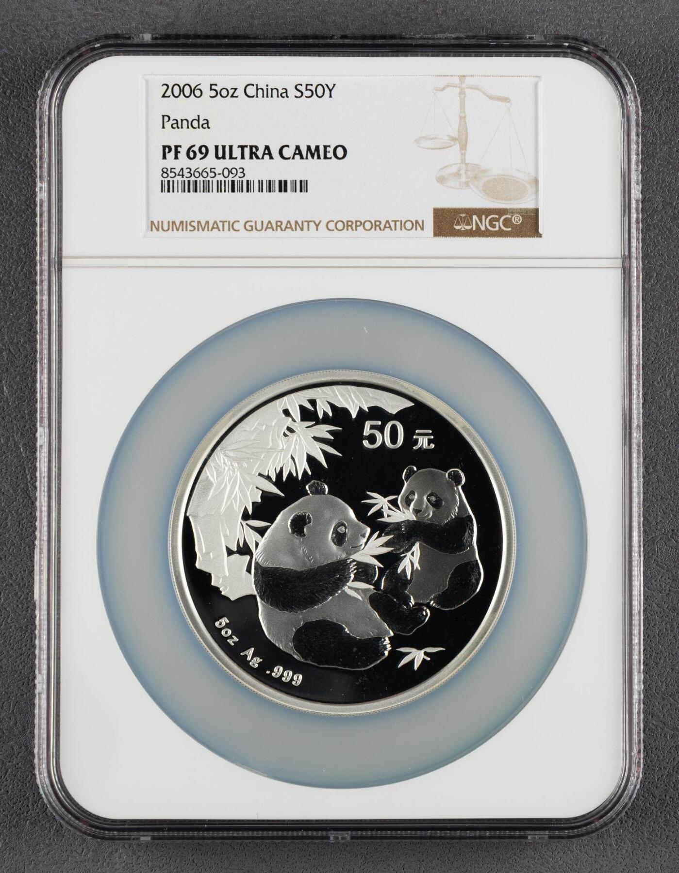 - 图案:双熊猫依偎于竹林间,大熊猫与幼崽共食竹叶,是2006年熊猫币经典设计