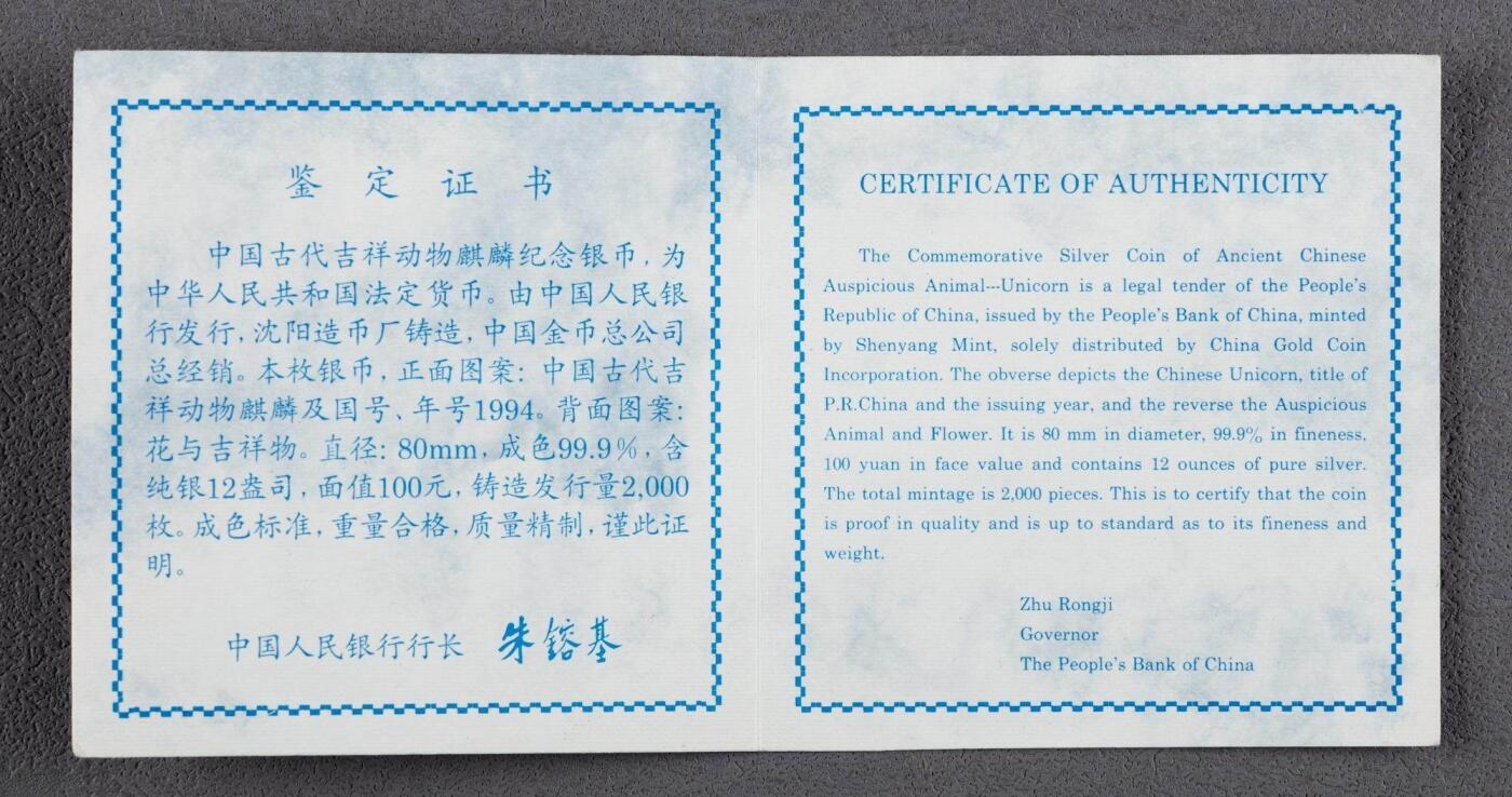 - 发行背景:为纪念中美文化交流发行的“中美吉祥物麒麟”系列首年品种,是90年代中国贵金属纪念币的经典大规格品种,融合了中国麒麟文化与西方独角兽文化,是中西文化融合的标志性藏品。