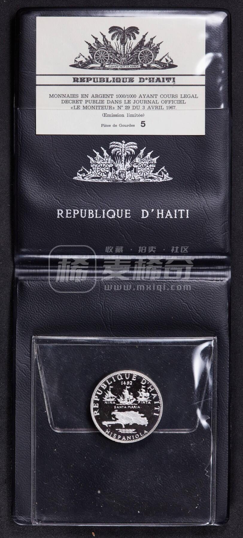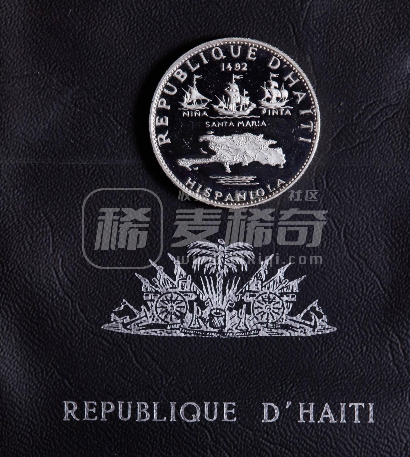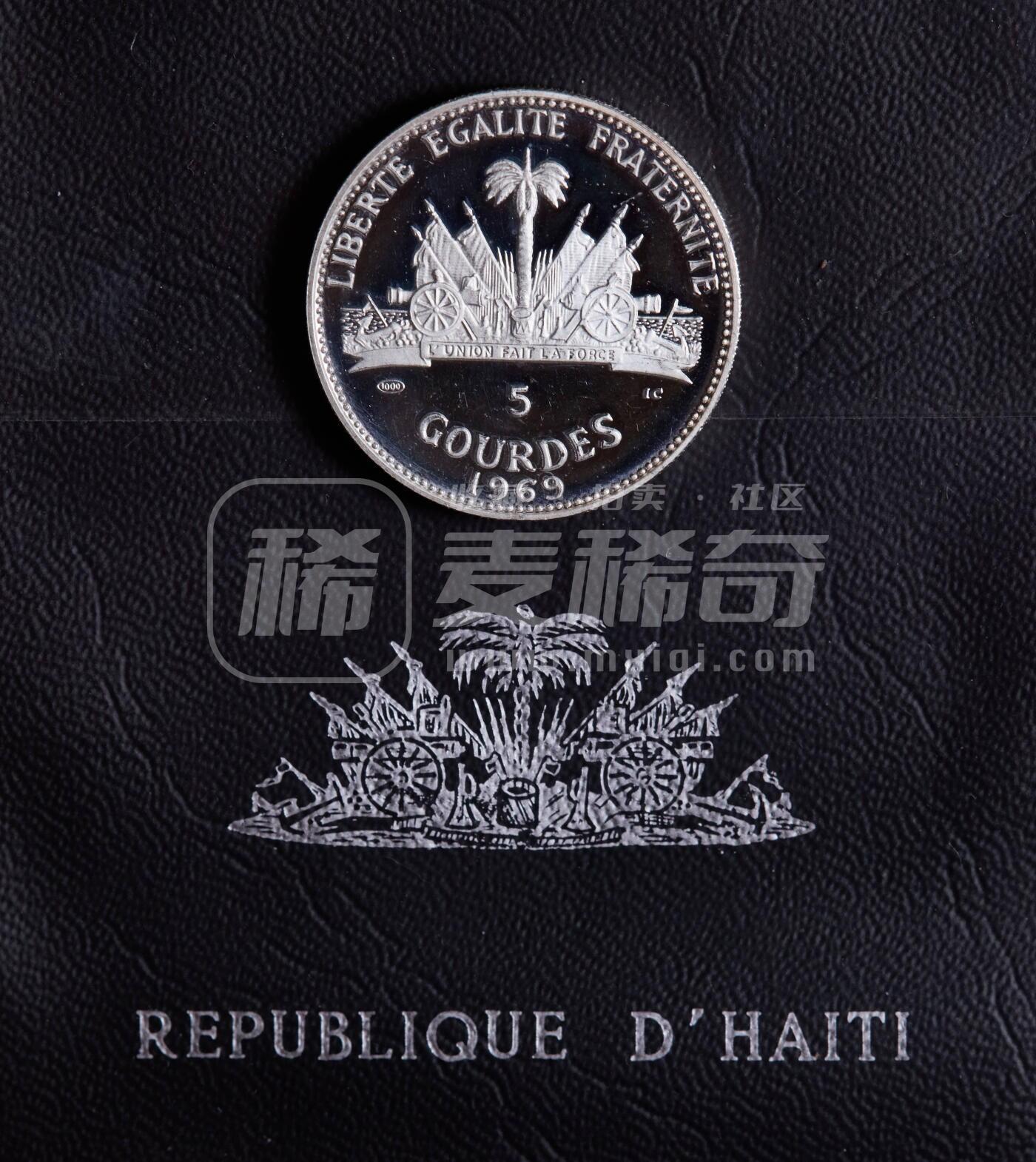 海地1969年纪念1960-1970年革命10周年-哥伦布发现美洲5古德精制银币,原包,重23.52克,99.9%银,发行量1175枚,少见品种
