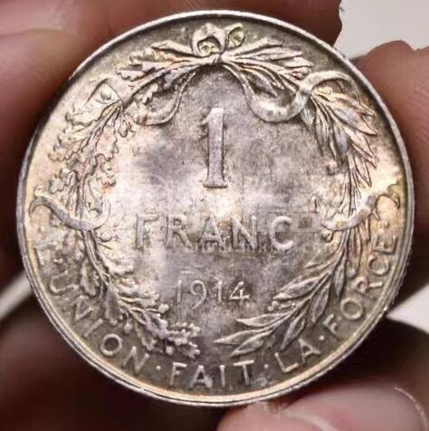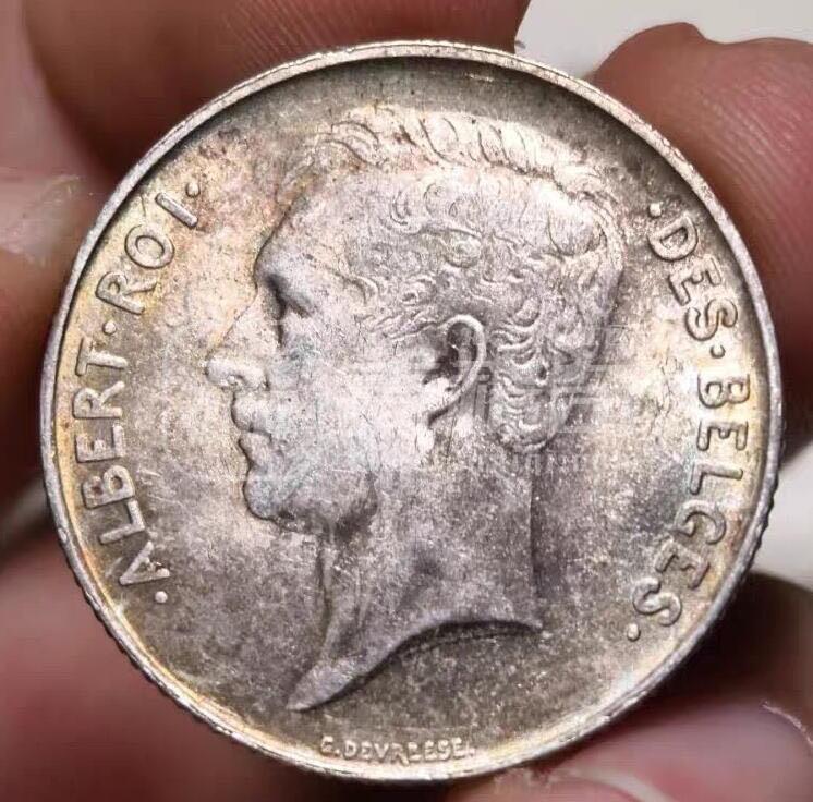 UNC未流通的品相 比利时王国阿尔伯特一世1法郎银币 整体金绿色包浆 包浆细节都好 打算送评大家猜猜看能出多少分呢?