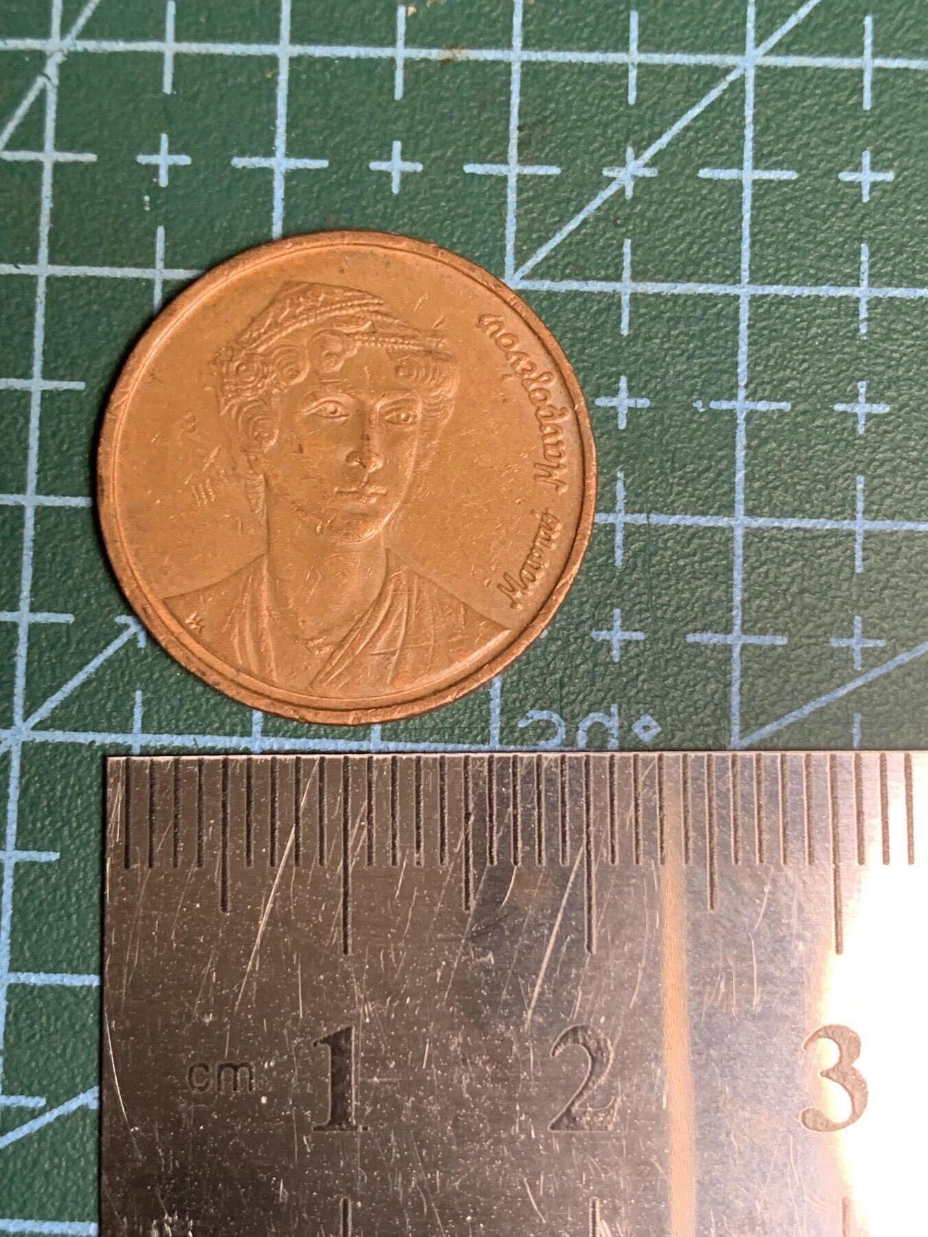 1988年希腊2德拉克马铜币,正面为诗人卡利马科斯,头戴花环,面容刻画温婉典雅;背面是船锚与舵轮组合,延续希腊航海文化符号。