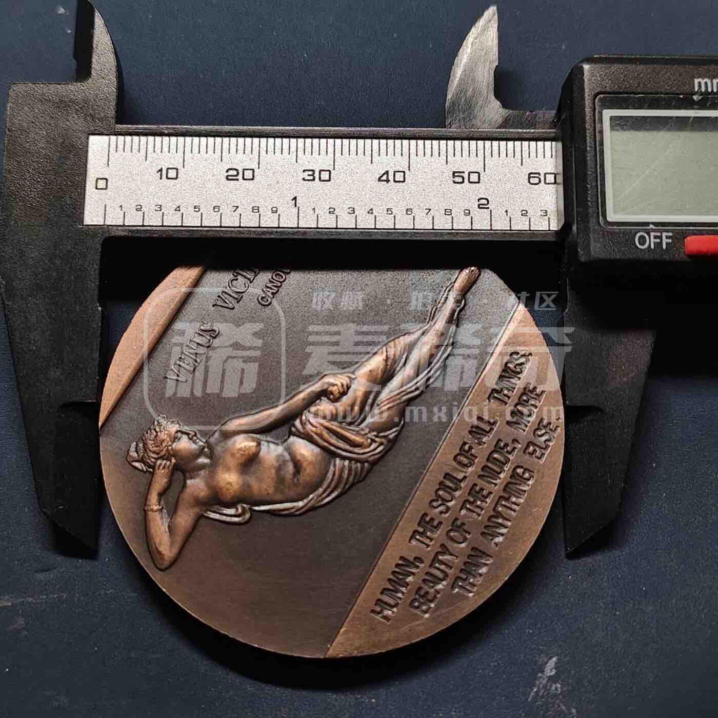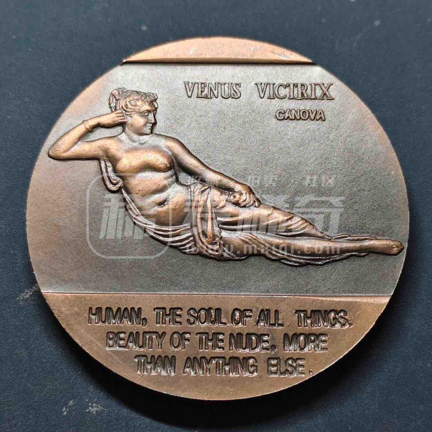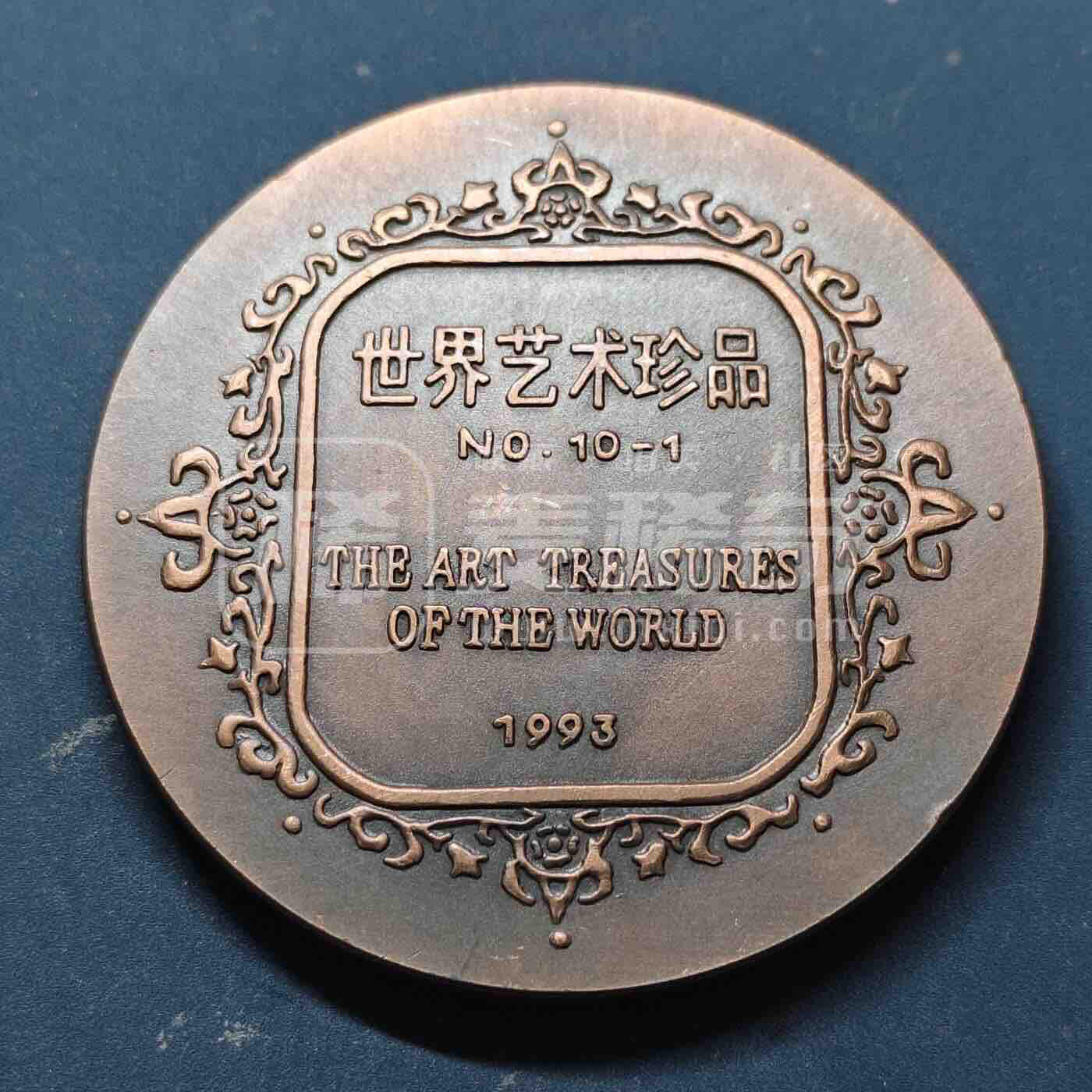 1993年上海造币厂铸造,属世界艺术珍品系列,紫铜材质,直径60mm。正面复刻卡诺瓦《胜利的维纳斯》雕塑,配英文铭文;背面为中英文“世界艺术珍品”标识,饰卷草纹,工艺细腻,具艺术收藏价值。