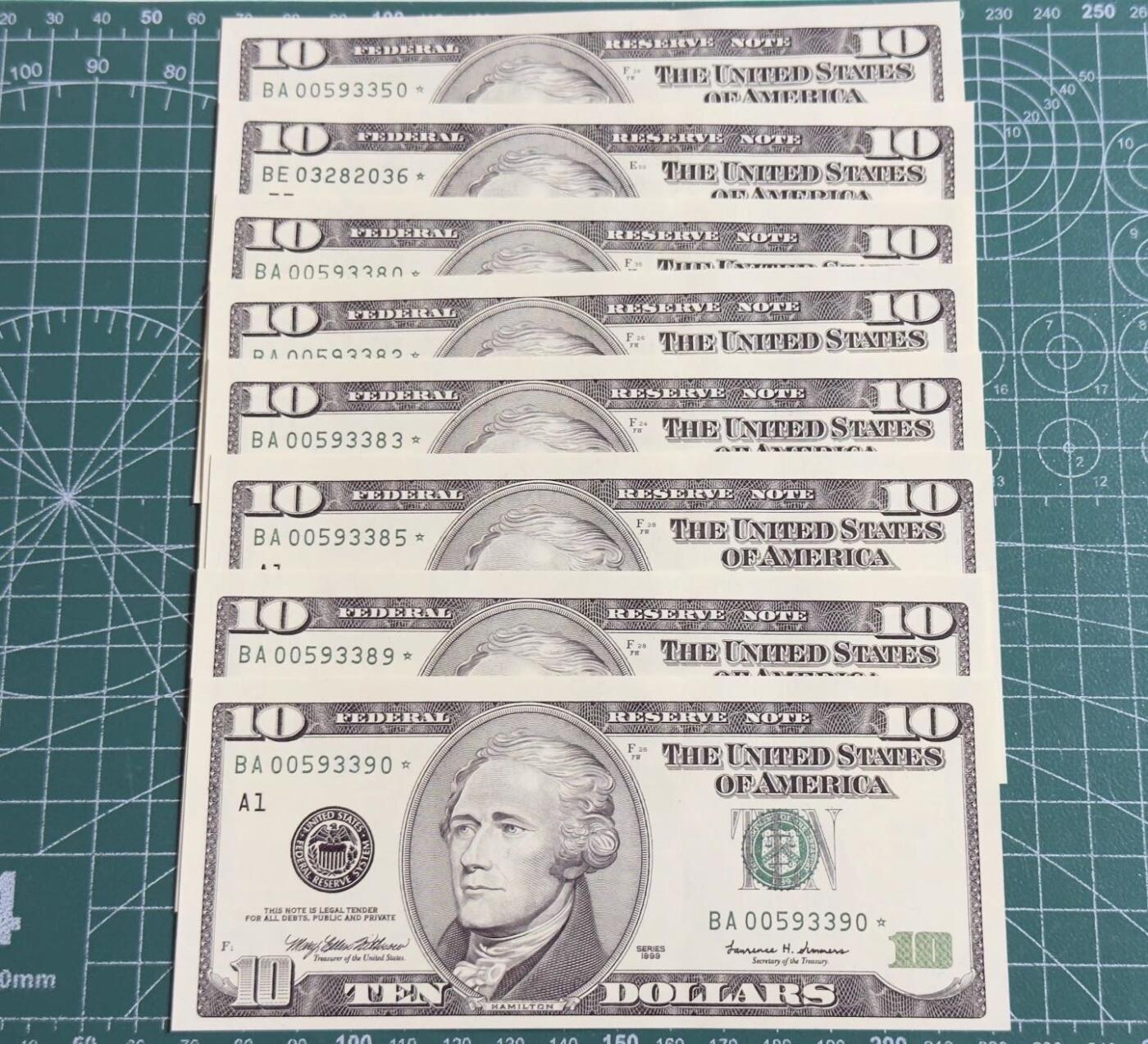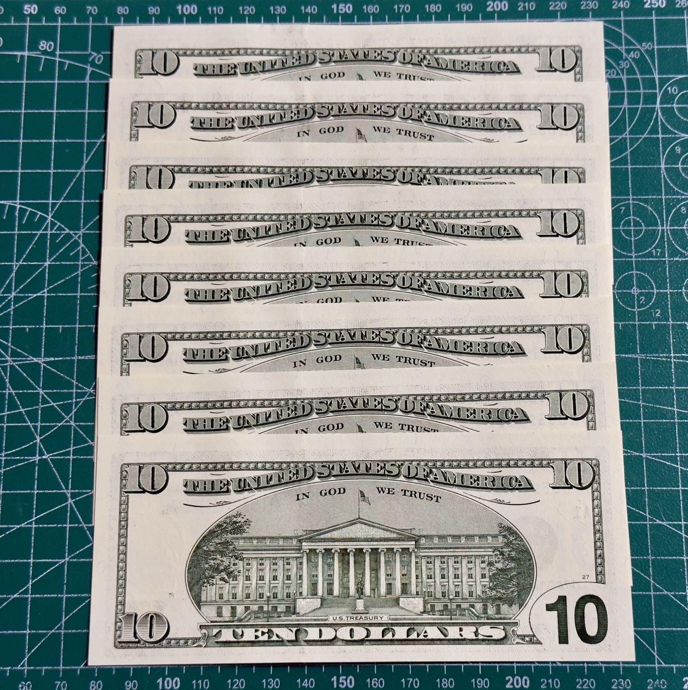 10美元券(1999)正面是美国第一任财政部长亚历山大.汉密尔顿(Alexander Hamilton,1755-1804)肖像。背面是美国财政部大楼。