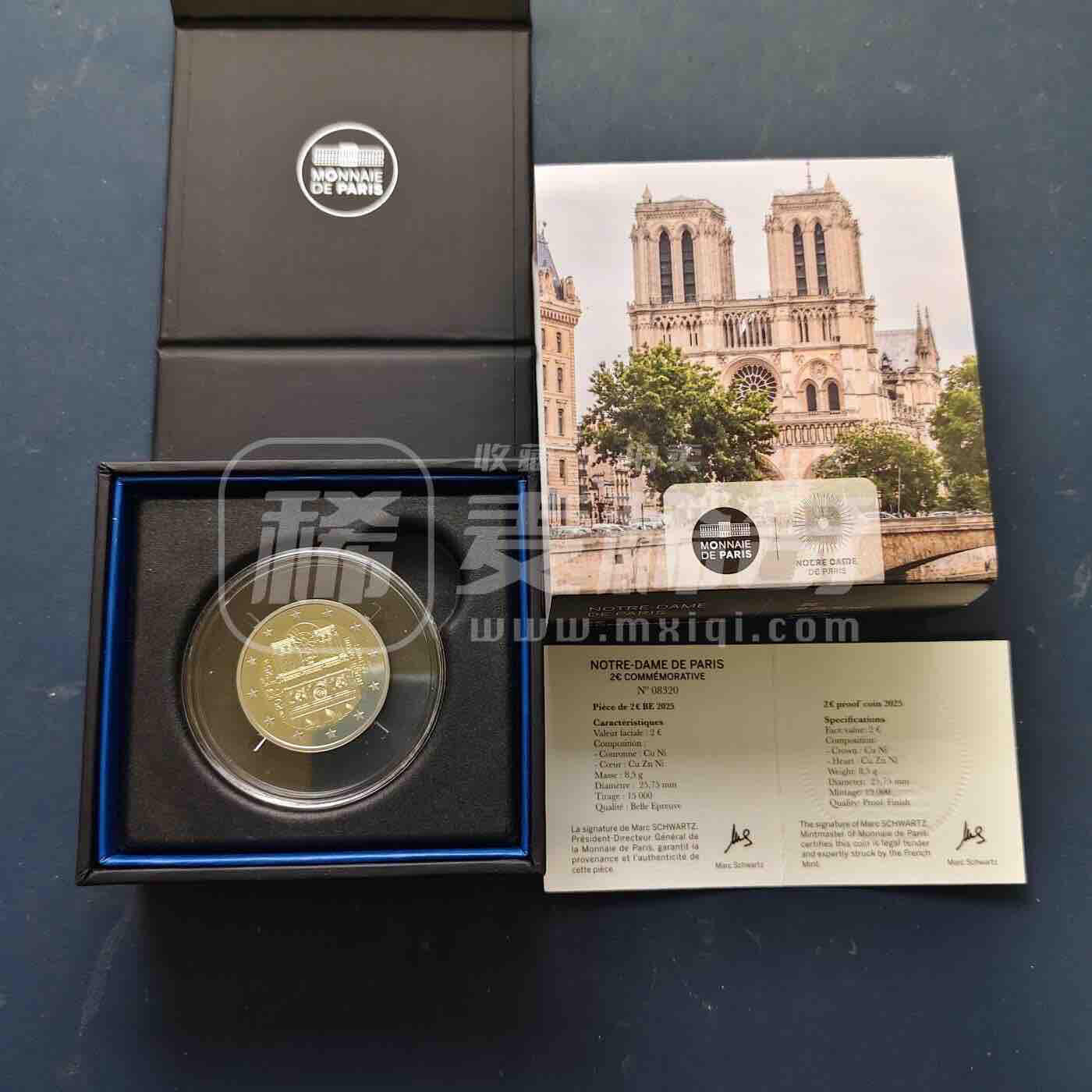 法国2025年巴黎圣母院重开纪念2欧元精制双色币,正面为圣母院西立面浮雕,标注“NOTRE-DAME DE PARIS”与年份,外环欧盟十二星;背面为标准2欧元样式。