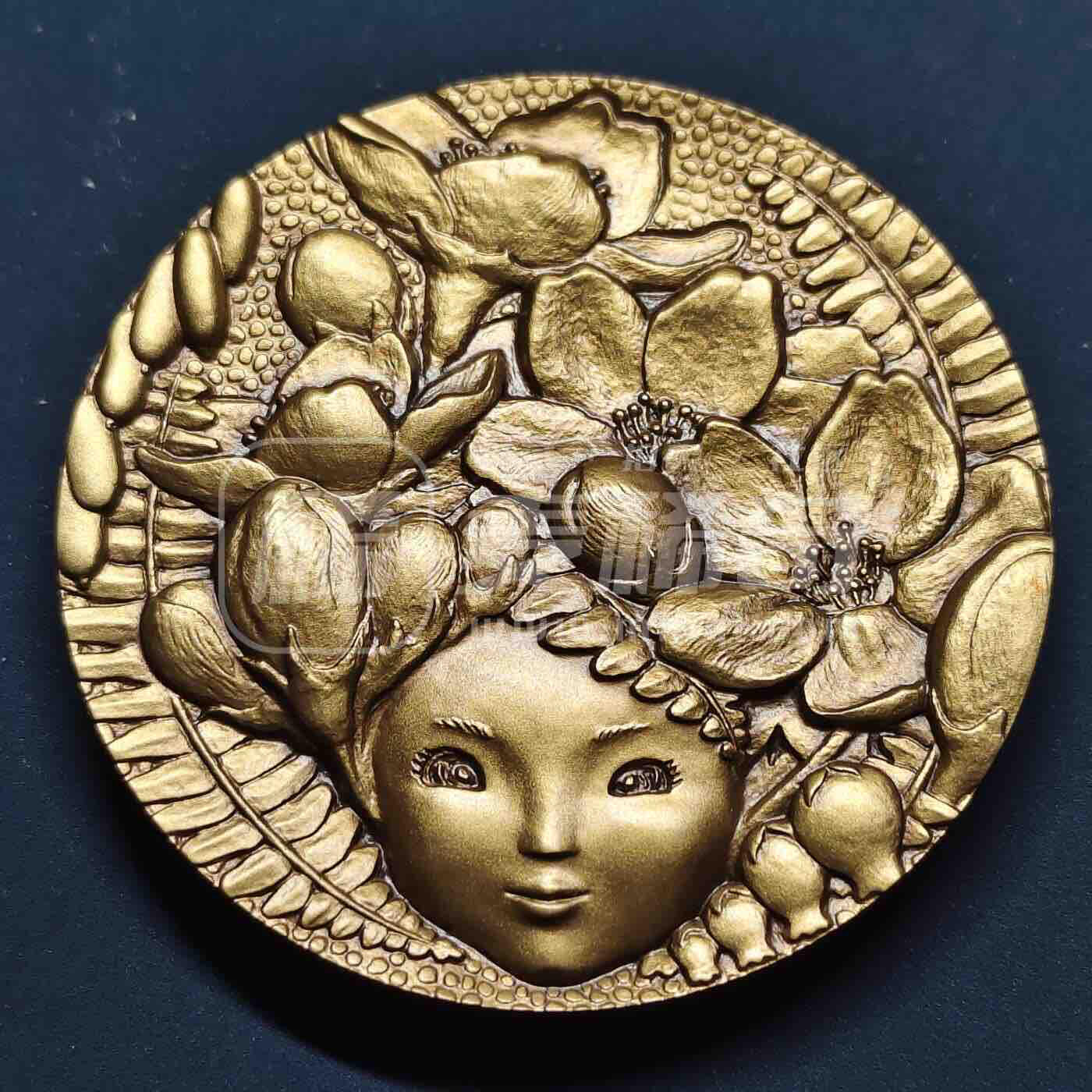 日本2005年樱花之道·红华樱花仙子大铜章,正面为高浮雕娇憨樱花仙子形象,头顶环绕樱花与枝叶;背面为红华樱花图案,属春季樱花题材收藏铜章。